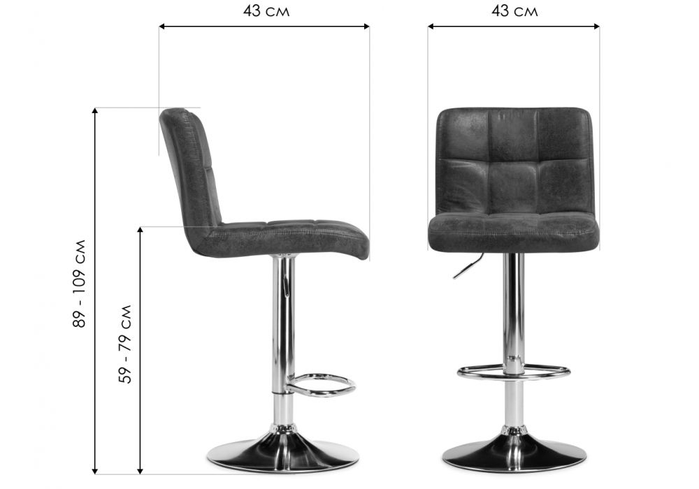 Материал каркаса - металл; Материал сиденья - ткань; Материал обивки - ткань; Цвет ножек - черный; Ширина - 43; Глубина - 43; Высота - 89; Высота сиденья - 59; Высота сиденья максимальная - 79; Высота максимальная - 109;