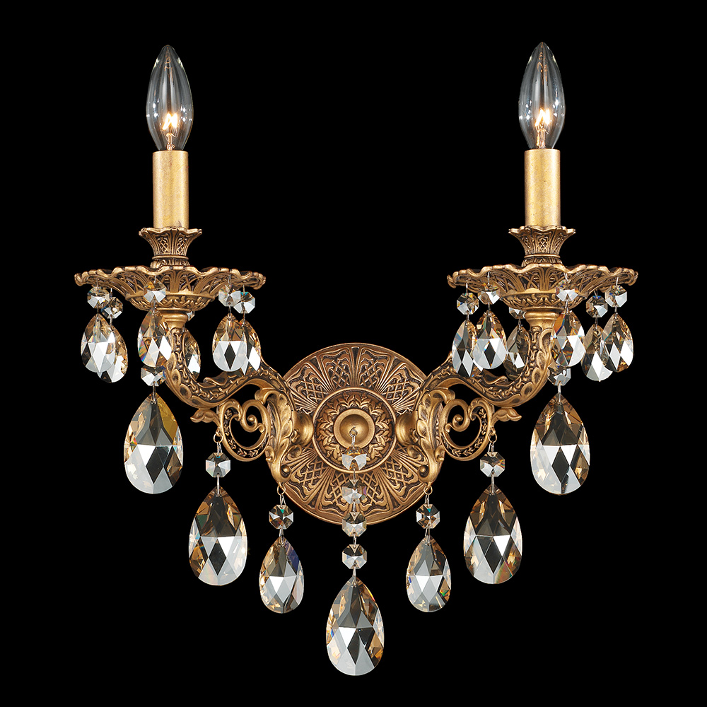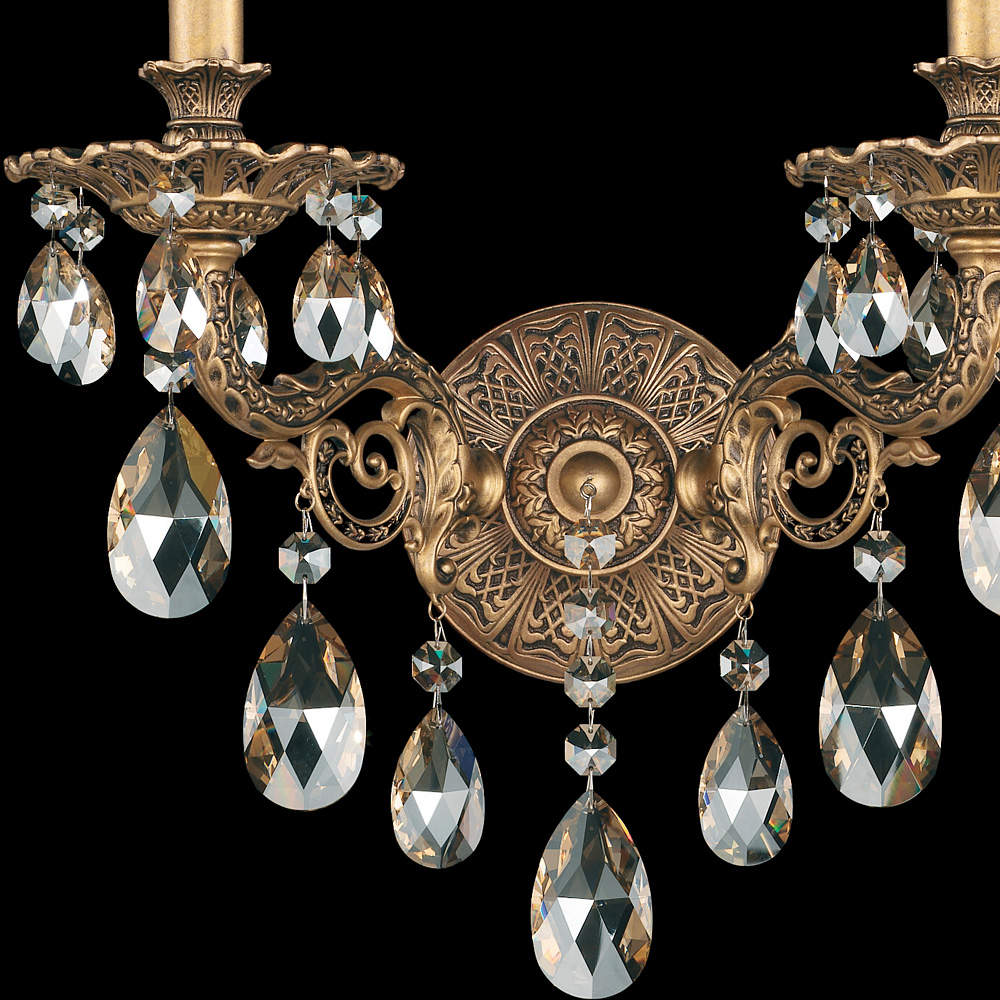 Бра 2-х рожковое из коллекции Milano на металлической арматуре цвета позолоченное олово. Декор: прозрачные подвески и кулоны из хрусталя Swarovski SPECTRA. Возможны другие варианты хрусталя по типу и цвету, а также различные покрытия металла