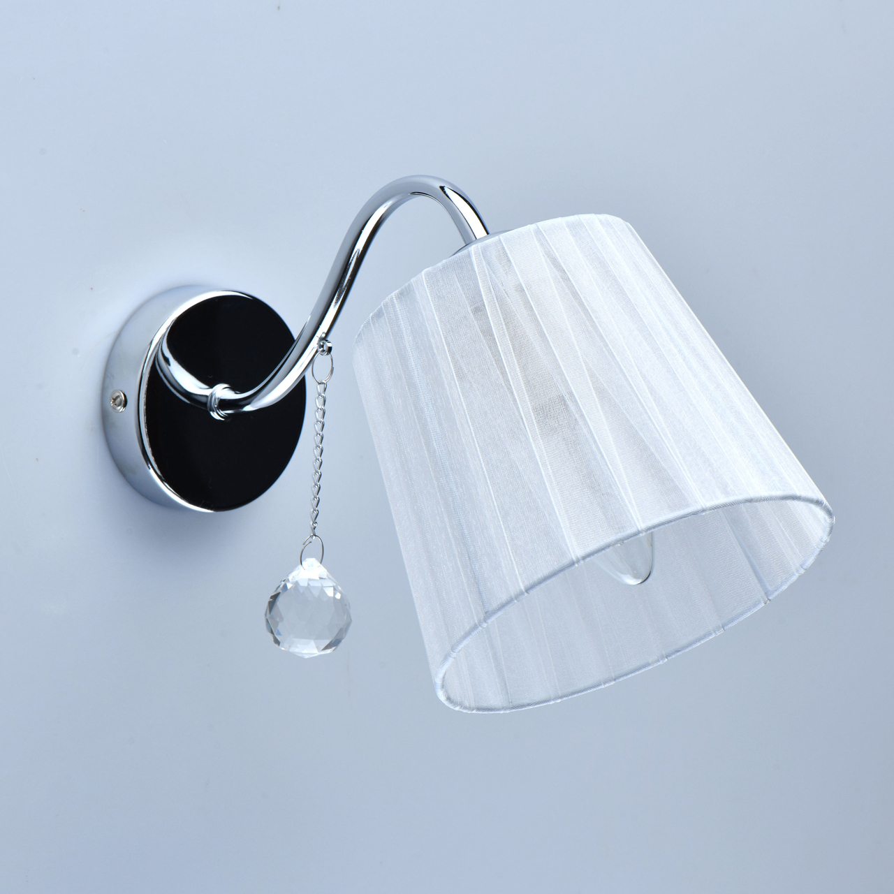 Основание бра выполнено из сплава металла и гальванизировано в цвет хрома. Абажур из прозрачной органзы белого цвета с термостойким акрилом внутри. Абажур отделан кантом сверху и снизу, прошит. Декор бра - металлическая цепочка цвета основания и прозрачный хрусталь в форме шара.