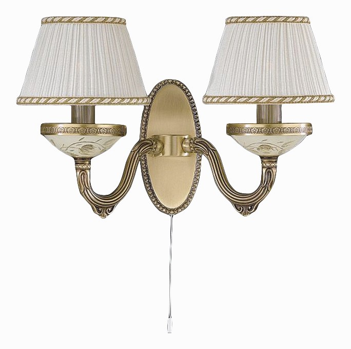 Бра Reccagni Angelo A 6422/2 Итальянского производсва – уникальное сочетание высокого качества и удивительных фактур. Этот светильник Классического стиля хорошо подойдет Для гостиной и придаст помещению мягкий и приятный свет. Плафоны белые из ткани. Арматура бронза из металла. Кол-во ламп - 2шт. Общая мощность 120W