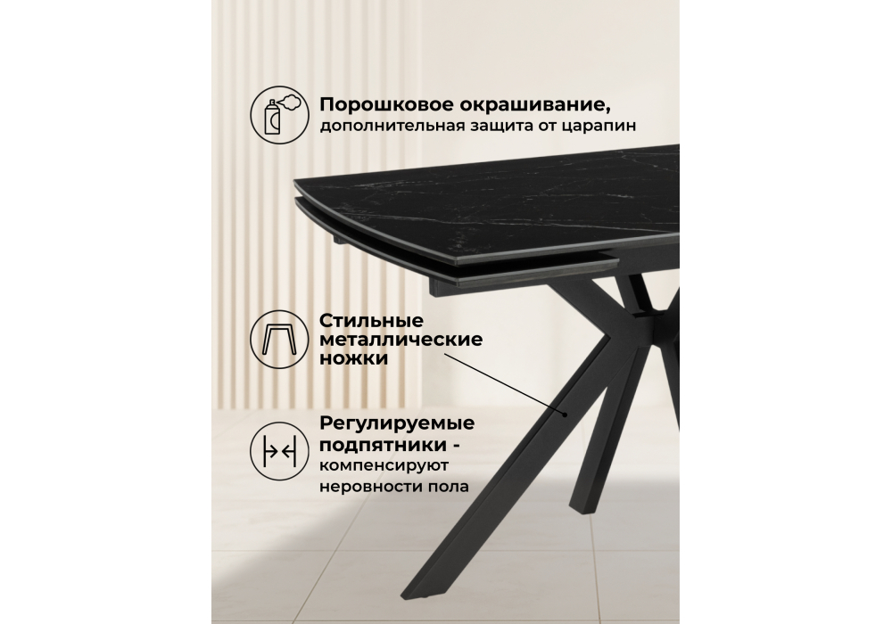 Материал каркаса - металл; Материал столешницы - Керамика; Ширина - 80; Высота - 77; Длина стола в разложенном виде - 180; Длина - 120;