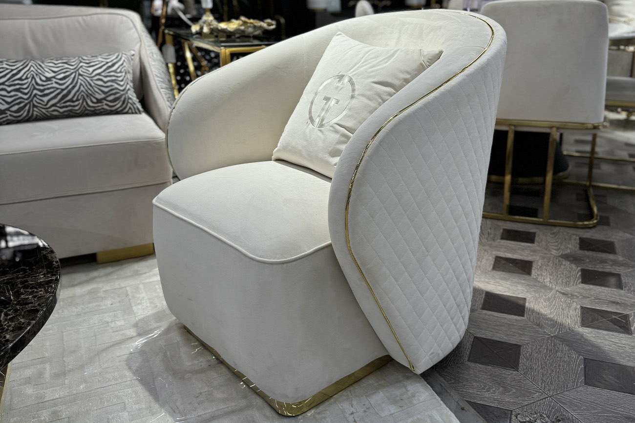 Мебель светлых оттенков - современный тренд. В данном кресле сочетается мягкий велюр нежного оттенка слоновой кости, золотое основание из нержавеющей стали и простроченная спинка.