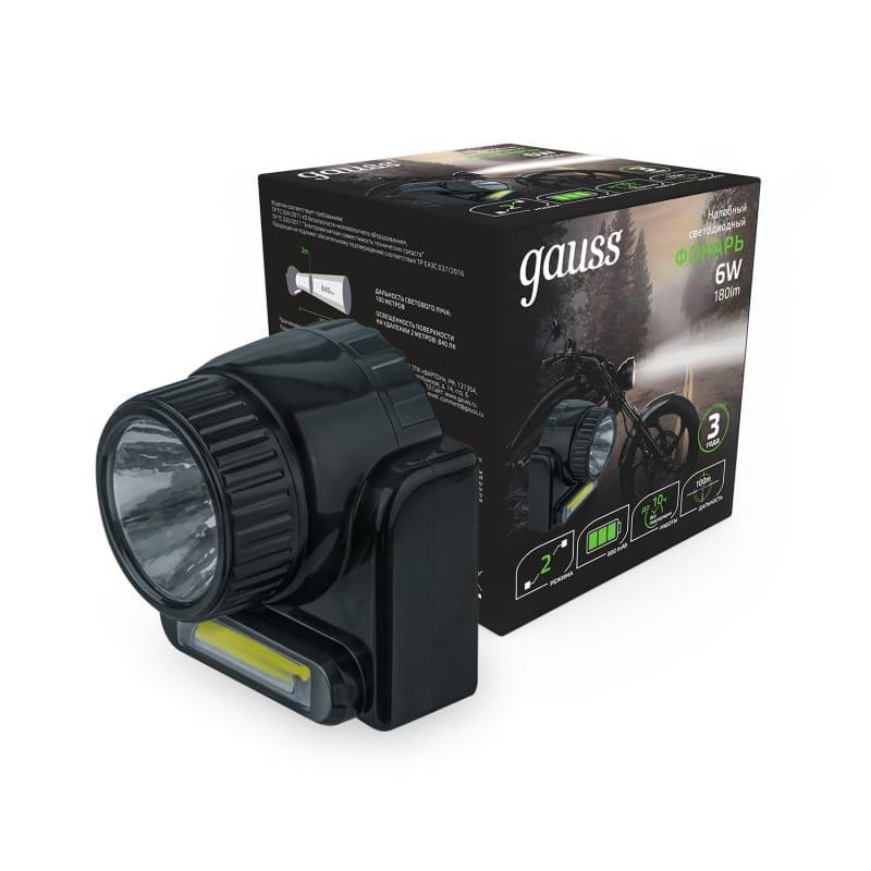 Купить "Налобный светодиодный фонарь Gauss аккумуляторный 75х70 180 лм GF309"