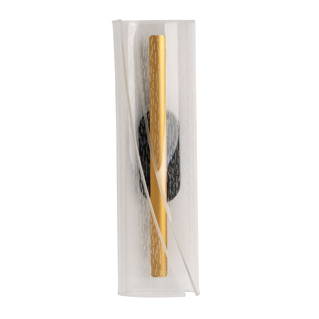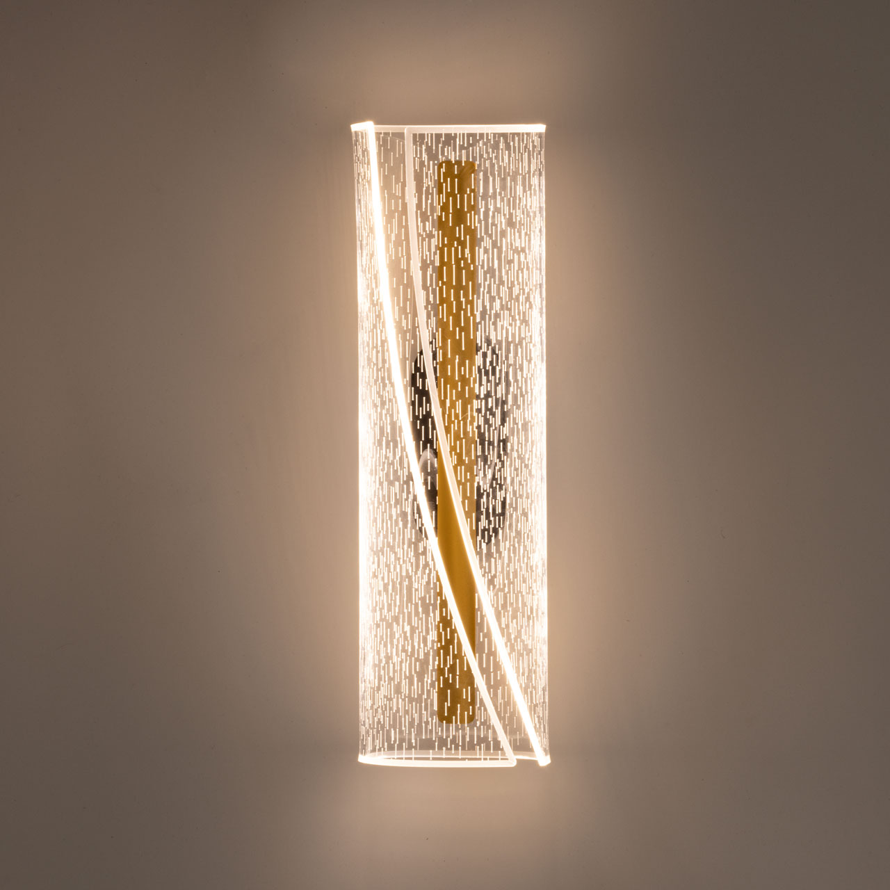 Металлическое основание настенного бра окрашено в черный цвет. Основа плафона выполнена из сплава алюминия с цинком и гальванизирована в цвет золота. Настенное бра декорировано прозрачным акриловым плафоном.