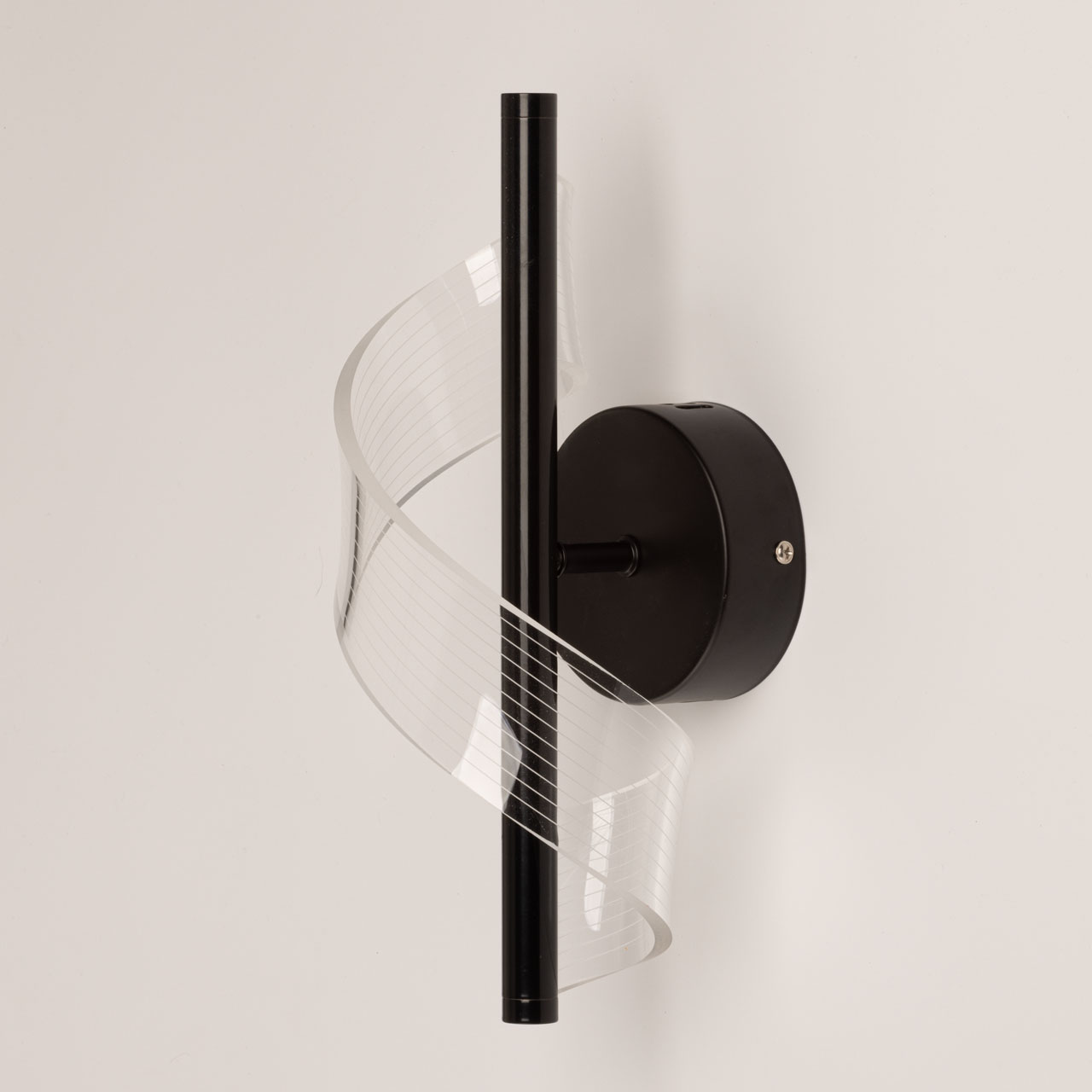 Черный цвет основания настенного бра привлекает к себе внимание и эффектно выделяет вертикальное бра на стене. Оригинальный плафон из прозрачного акрила в виде закрученной ленты делает настенное бра арт объектом. Многорежимность с изменением цветовой температуры от 3000К до 6500К является элементом светодизайна и позволяет подобрать комфортную температуру света. Качественные светодиоды и корпус из сплава алюминия обеспечивают яркое освещение и долгий срок службы. Светодиодные источники света экономичны и безопасны.