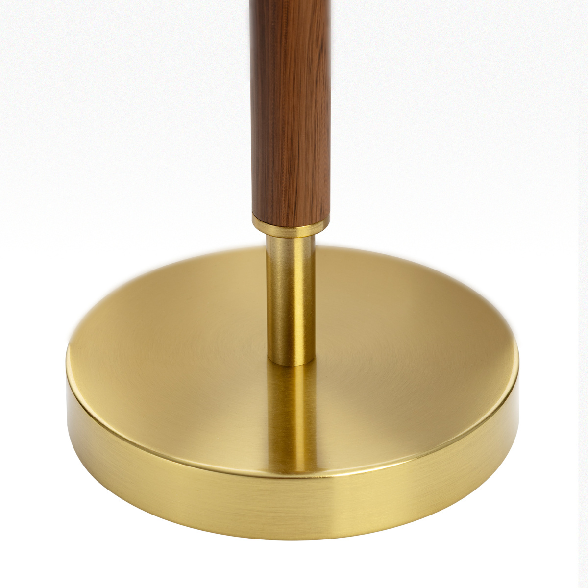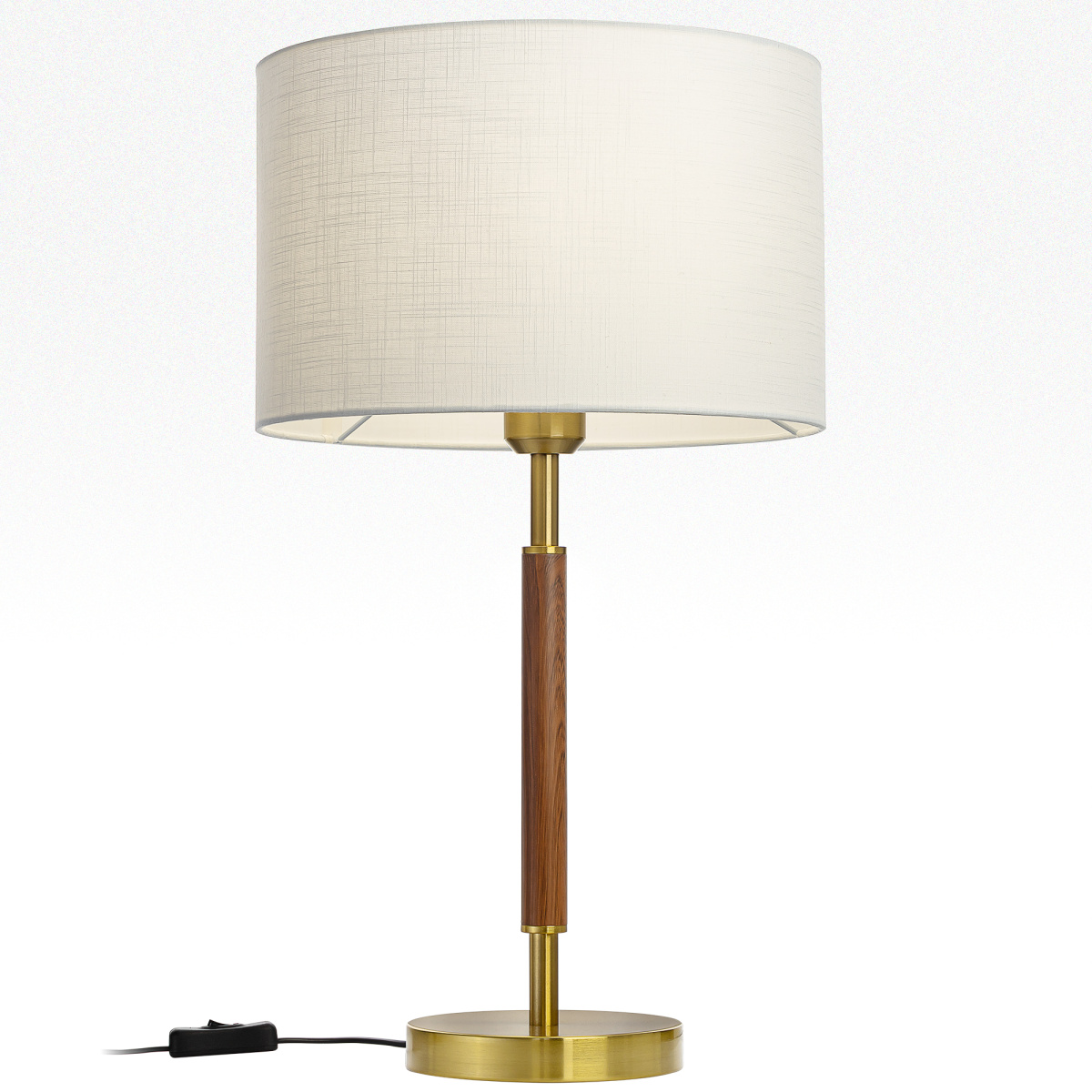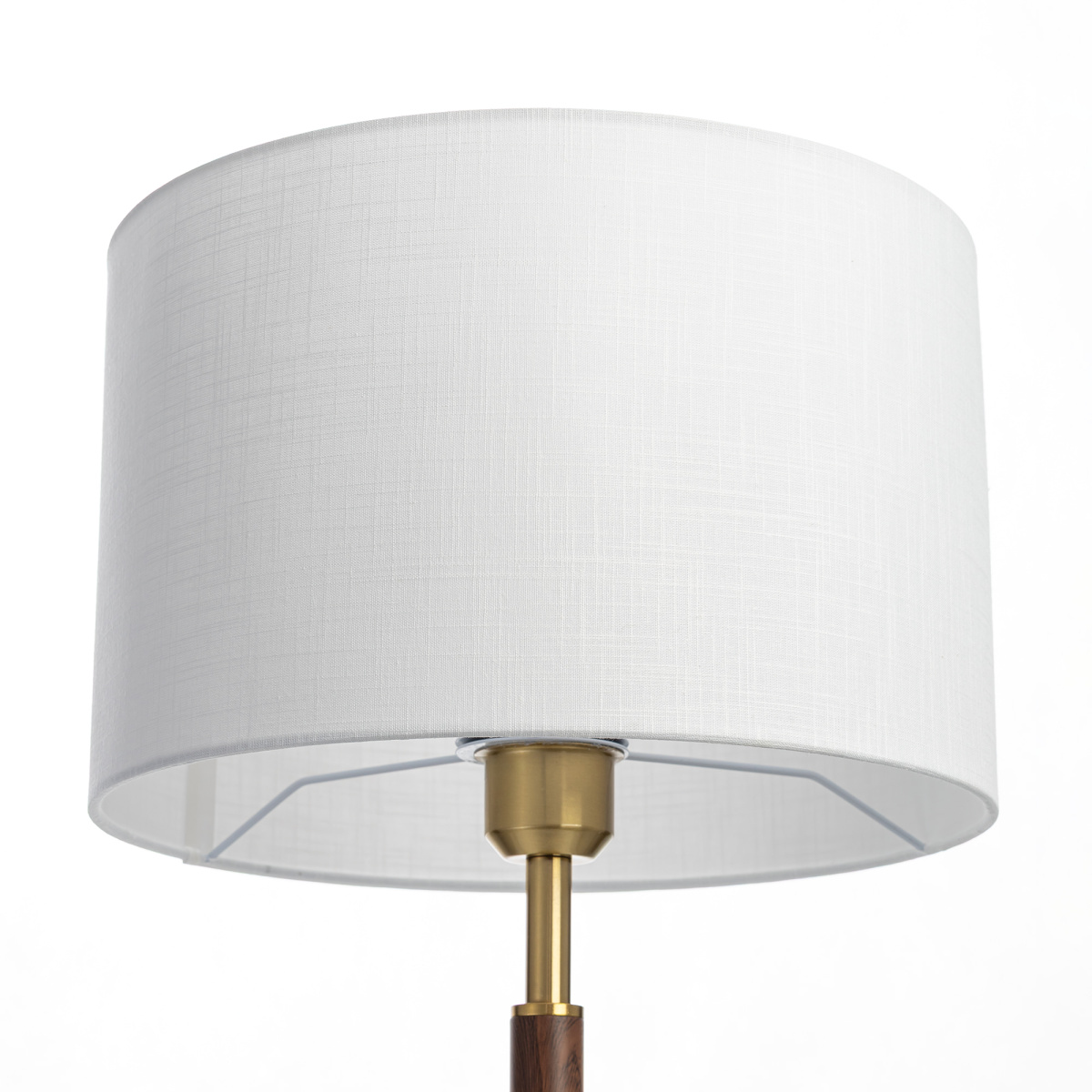Бронзовый металлический каркас с декоративными элементами с текстурой под дерево. Абажур — в форме цилиндра, изготовленный из молочно-белой ткани с чуть шероховатой текстурой.
