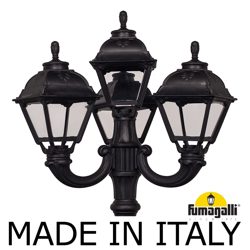 Парковый фонарь FUMAGALLI среднего размера серии CEFA, модель NEBO OFIR/CEFA 3L+1. Парковый фонарь с 3 светильниками на консолях OFIR + 1 венчающий, установленных на классическом столбе NEBO высотой 2,5 м (+высота фонарей на кронштейнах). Изготовлены в Италии, по уникальным технологиям "FUMATECH" из современного композитного полимера RESIN. Этот материал в 5 раз прочнее металла, не ржавеет, не окисляется, не выгорает на солнце, его не нужно красить. Все светильники пыле-влаго защищены по стандарту IP55 (Пылезащищенные, защита от водяных струй с любого направления). Рассеиватель выполнен из антивандального, не мутнеющего и не горючего PMMA (ПолиМетилМетаАкрилат). Срок службы светильника - не менее 20 лет. Температура использования от -60 до +90. В серии CEFA есть садовые фонари в настенном (OFIR/CEFA, MIRRA/CEFA) подвесном (SICHEM/CEFA) и наземном исполнении (IAFAET.R/CEFA, ALOE.R/CEFA, ARTU/CEFA, GIGI/CEFA, RICU/CEFA, NEBO/OFIR/CEFA 1L, NEBO/OFIR/ANNA 2L, TABOR/ADAM/CEFA 3L) со столбами разной высоты, с разным количеством и конфигурацией голов. Консоли настенных фонарей и кронштейны светильников на столбах освещения могут устанавливаться в положение вверх и вниз. Столбы выше 150 см имеют в основе мощную стальную трубу с двойной оцинковкой. При заказе требуется выбрать цвет корпуса, цвет плафона и тип патрона (Е-27 или LED GX-53). Возможен светодиодный вариант. По стилю и дизайну серия уличных светильников CEFA похожа на светильники большого размера серии SIMON . По размеру относится к средним парковым светильникам как серия RUT и GLOBE 300.
