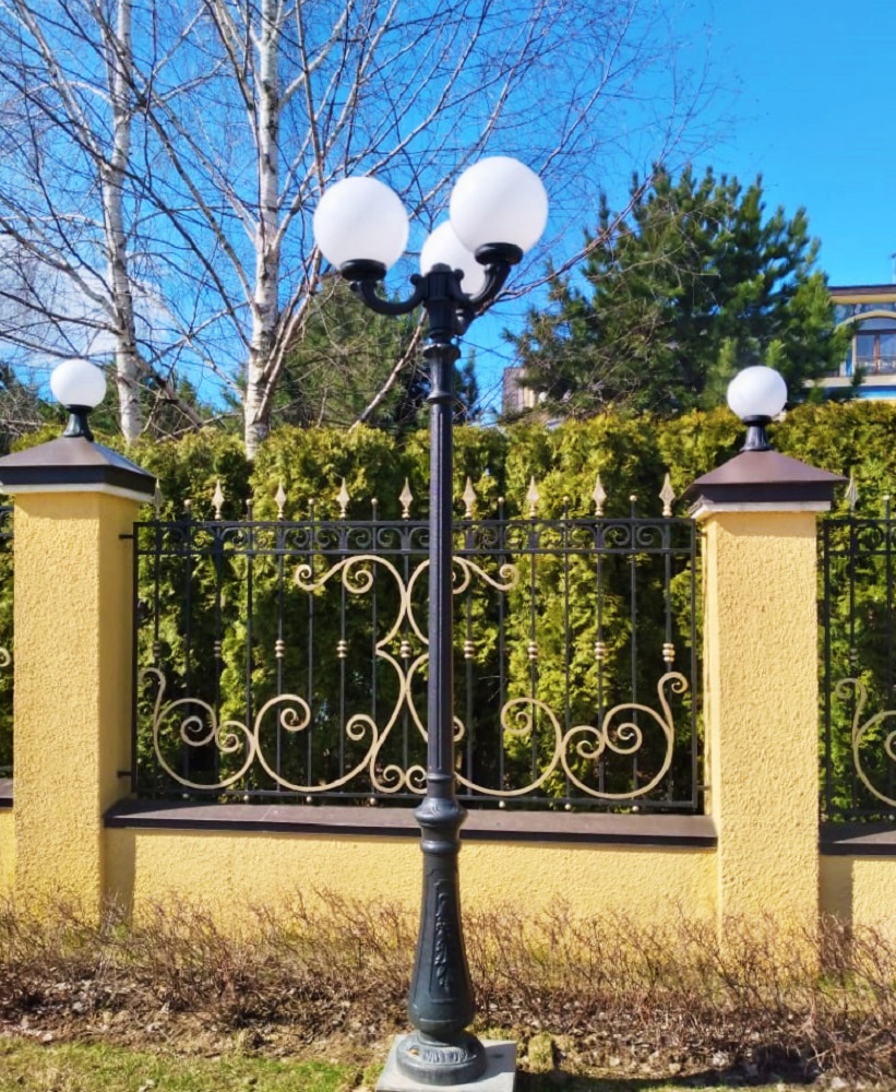 Парковый фонарь FUMAGALLI среднего размера серии GLOBE 300, модель NEBO OFIR/GLOBE 300 3L. Парковый фонарь с 3 светильниками, на консолях OFIR среднего размера, установленных на классическом столбе NEBO высотой 2,5 м (+высота фонарей на кронштейнах). Изготовлены в Италии, по уникальным технологиям "FUMATECH" из современного композитного полимера RESIN. Этот материал в 5 раз прочнее металла, не ржавеет, не окисляется, не выгорает на солнце, его не нужно красить. Все светильники пыле-влаго защищены по стандарту IP55 (Пылезащищенные, защита от водяных струй с любого направления). Рассеиватель выполнен из антивандального, не мутнеющего и не горючего PMMA (ПолиМетилМетаАкрилат). Срок службы светильника - не менее 20 лет. Температура использования от -60 до +90. В серии GLOBE 300 есть садовые фонари в настенном (OFIR/GLOBE 300, MIRRA/GLOBE 300) подвесном (SICHEM/GLOBE 300) и наземном исполнении (IAFAET.R/GLOBE 300, ALOE.R/GLOBE 300, ARTU/GLOBE 300, GIGI/GLOBE 300, RICU/GLOBE 300, NEBO/OFIR/GLOBE 300 1L, NEBO/OFIR/GLOBE 300 2L, TABOR/ADAM/GLOBE 300 3L) со столбами разной высоты, с разным количеством и конфигурацией голов. Консоли настенных фонарей и кронштейны светильников на столбах освещения могут устанавливаться в положение вверх и вниз. Столбы выше 150 см имеют в основе мощную стальную трубу с двойной оцинковкой. При заказе требуется выбрать цвет корпуса, цвет плафона и тип патрона (Е-27 или LED GX-53). Возможен светодиодный вариант. По стилю и дизайну серия уличных светильников GLOBE 300 похожа на светильники большого размера серии GLOBE 250 и GLOBE 400 . По размеру относится к средним парковым светильникам как серия RUT и CEFA.