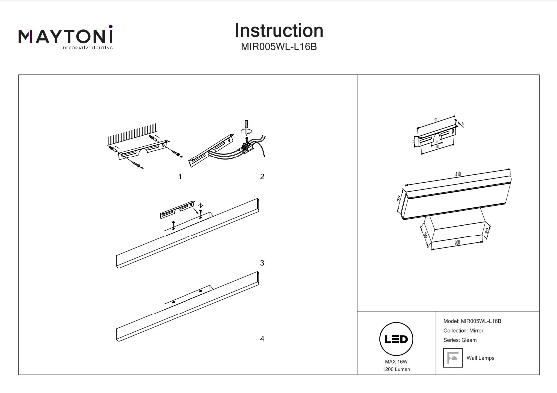 Подсветка для зеркал Maytoni Gleam MIR005WL-L16B, входящая в коллекцию Mirror, отлично подойдет для освещения пространства над зеркалом в спальне, на даче, в прихожей, оформленных в современном стиле или в стиле Хай-тек. Данный артикул имеет один прямоугольный плафон матового белого цвета длиной 41 см, выполненный из пластика и направленный вниз, а также черную арматуру, изготовленную из металла. Отступ от стены составляет 8,5 см. Немецкий производитель Maytoni дает гарантию на свое изделие 3 года и обращает внимание на то, что осветительный элемент с цоколем LED встроен в конструкцию и не требует приобретения дополнительных лампочек, а общая мощность светильника составляет 16 Вт, что позволяет осветить помещение площадью 3 кв. м. Способ крепления светильника к стене на планку позволяет быстро и просто осуществить монтаж. Строгий, лаконичный дизайн и прямоугольная форма плафона подсветки для зеркал Maytoni Gleam MIR005WL-L16B делают ее особенным элементом декора, который украсит любое интерьерное пространство.