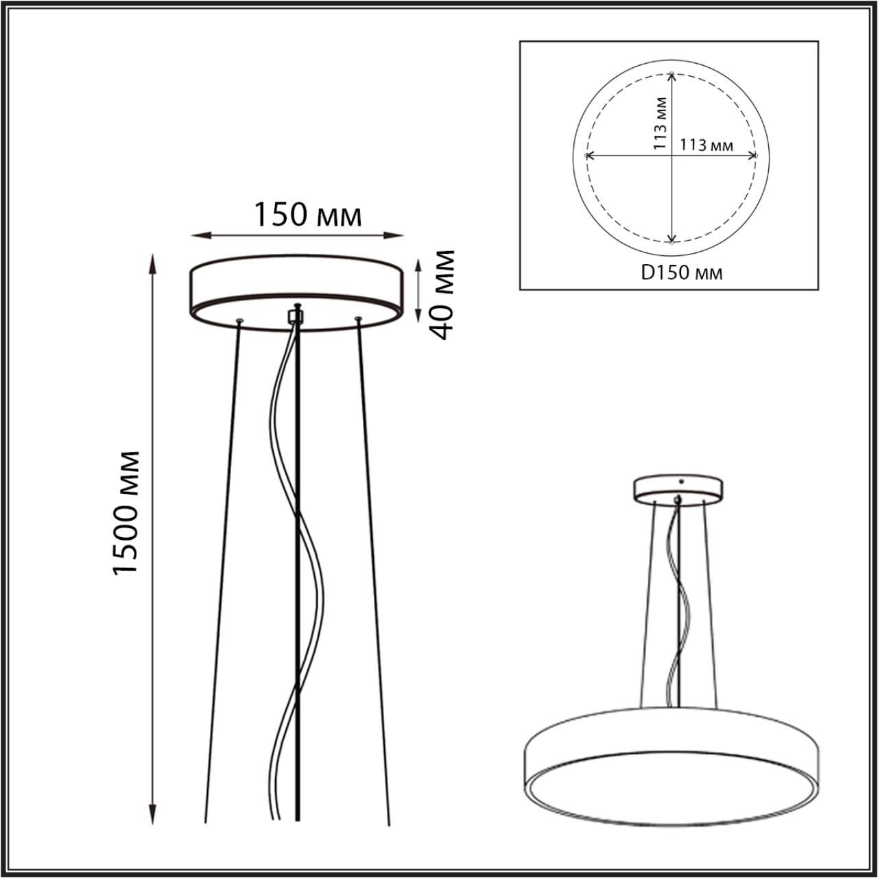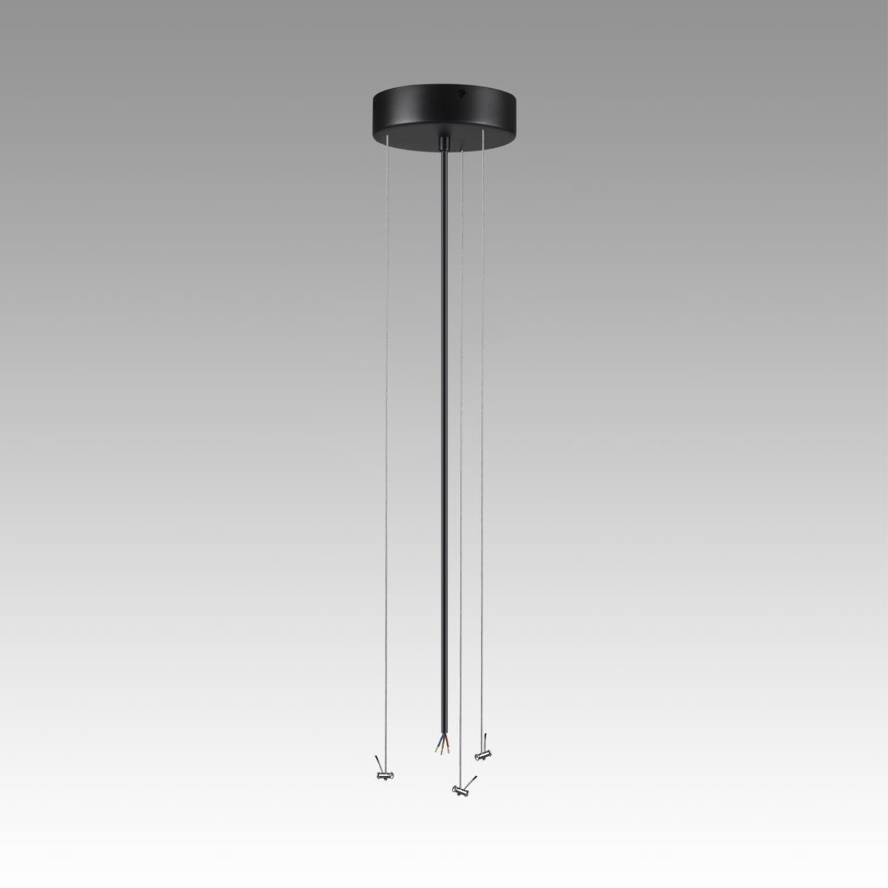 Тросы подвесного крепление для модели QUASAR LED выполнены из металла в приятной на ощупь силиконовой оплетке. Питающий провод и потолочная чаша выполнены в цвете внешнего контура корпуса светильника - угольно-черном.