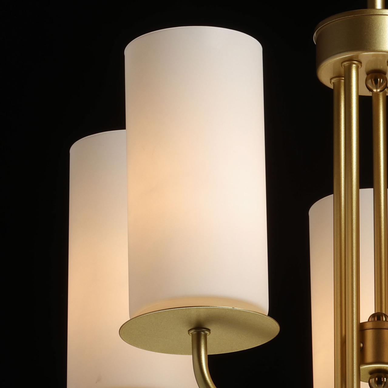 Металлическое основание люстры окрашено в цвет перламутрового золота. Стеклянные плафоны окрашены в белый цвет.