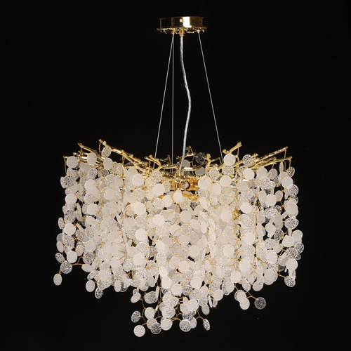 Основание подвесной люстры выполнено по технологии художественного литья из сплава алюминия с цинком и гальванизировано в цвет золота. Люстра декорирована прозрачным фактурным стеклом круглой формы.