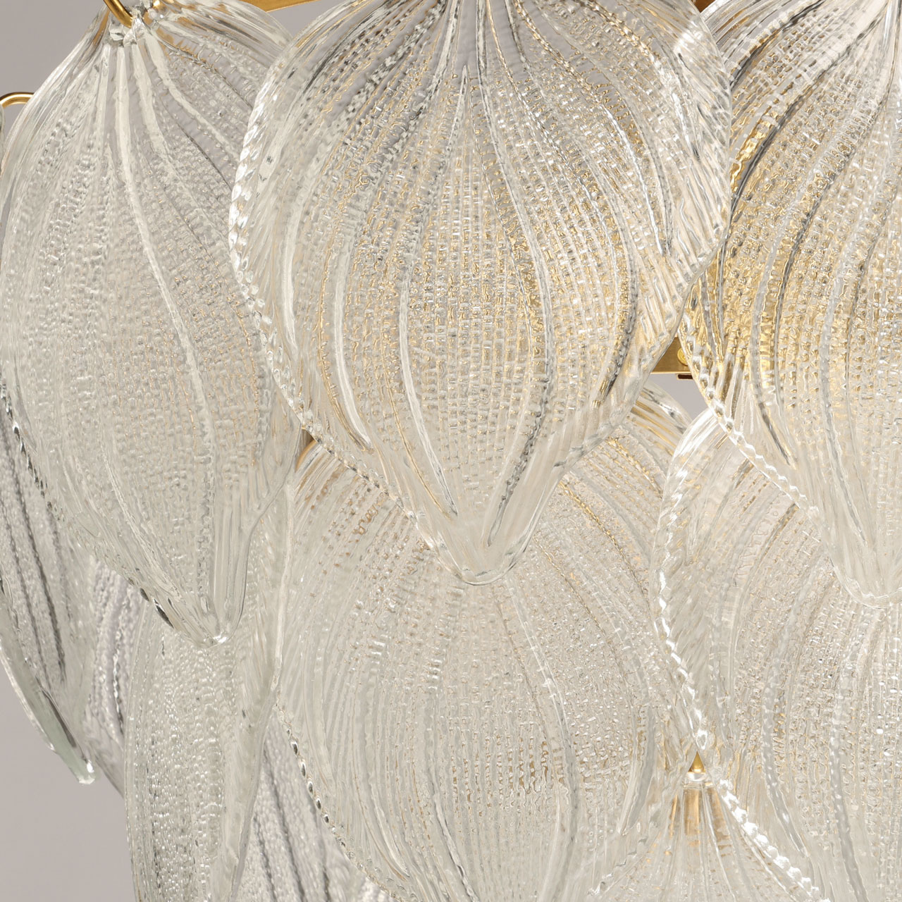 Металлическое основание подвесной люстры гальванизировано в цвет латуни. Светильник декорирован белыми стеклянными пластинами в форме листьев.