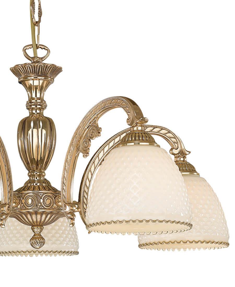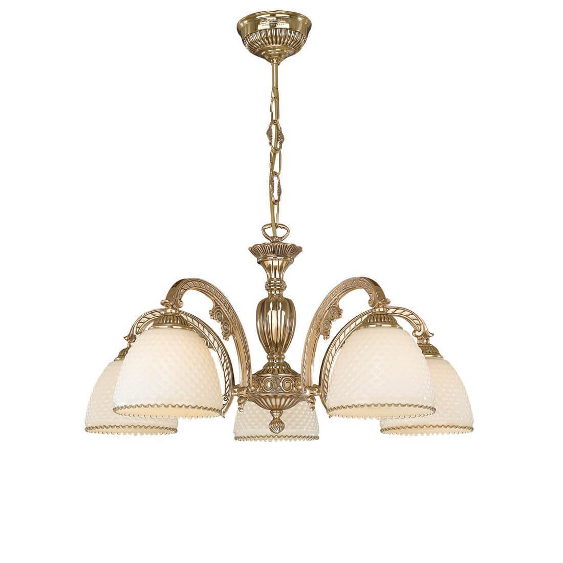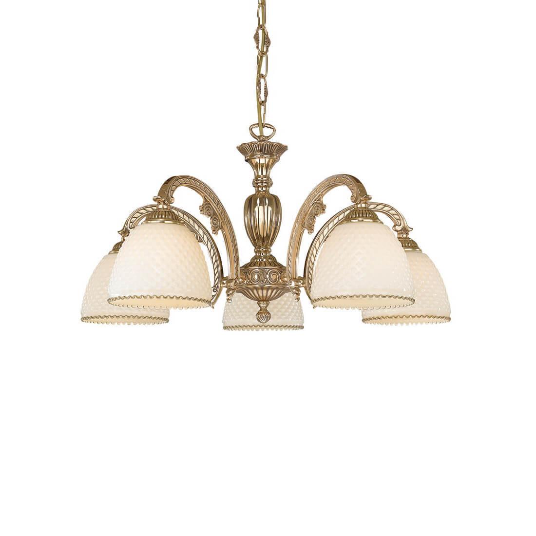 Подвесная люстра Reccagni Angelo L 7105/5 Итальянского производсва – отличный выбор для Вас. Этот светильник Классического стиля хорошо подойдет Для гостиной и придаст помещению мягкий и приятный свет. Плафоны белые из стекла. Арматура золотая из металла. Кол-во ламп - 5шт. Общая мощность 300W