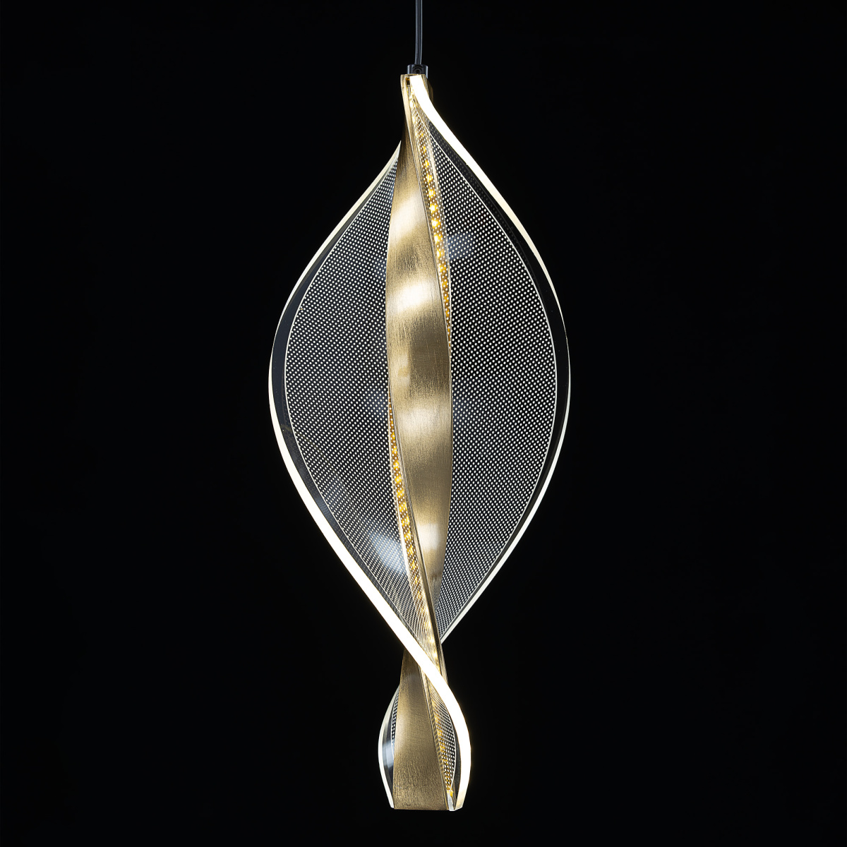 Основание металлическое, оттенка латунь, поверхность матовая. Подвесной светодиодный модуль оригинальной формы можно зафиксировать на разной высоте, создав свой индивидуальный дизайн. Корпус LED-модуля — алюминиевый с гальваническим покрытием, цвет благородная бронза. Витой рассеиватель изготовлен из прозрачного оптического акрила с изящной точечной гравировкой.