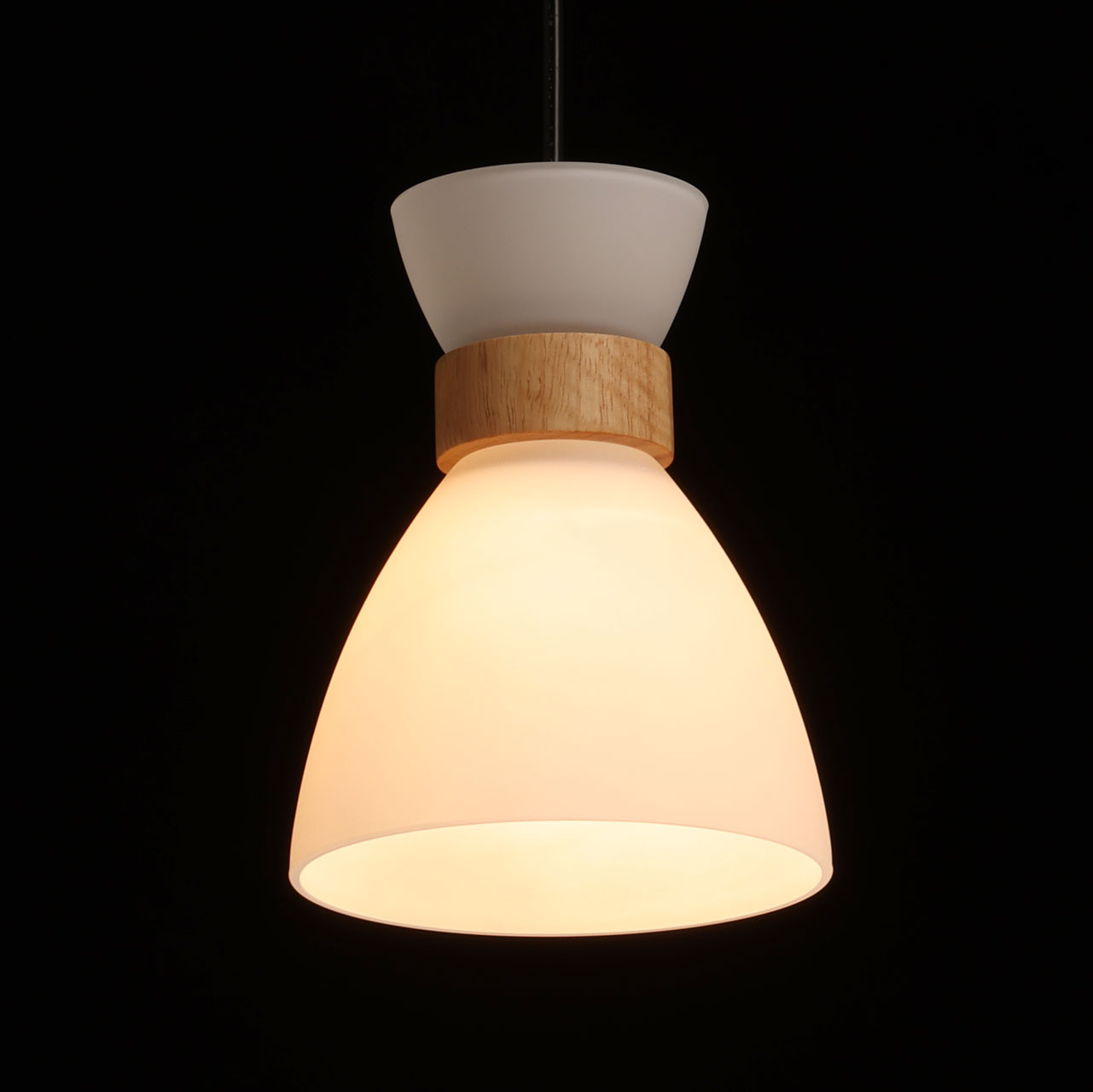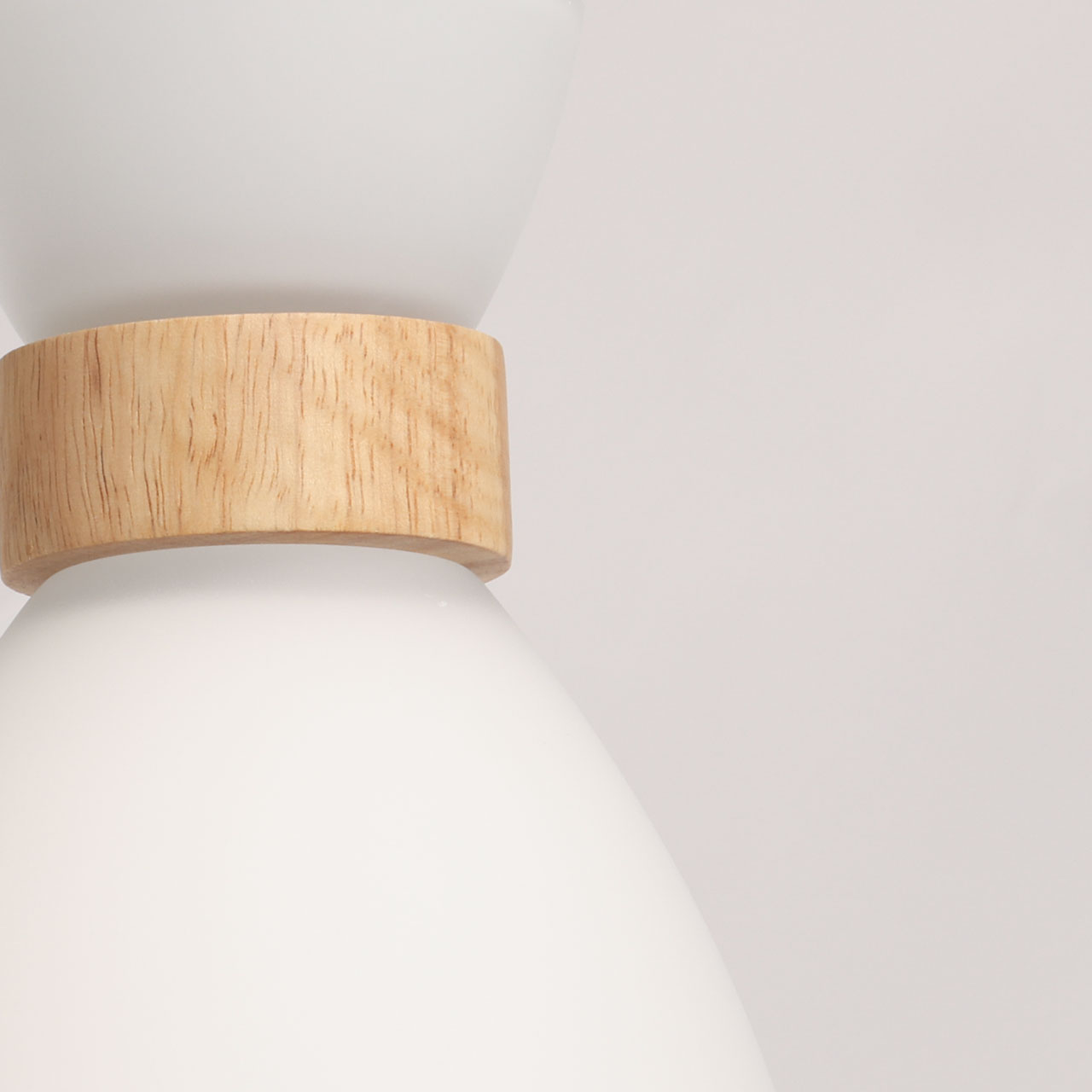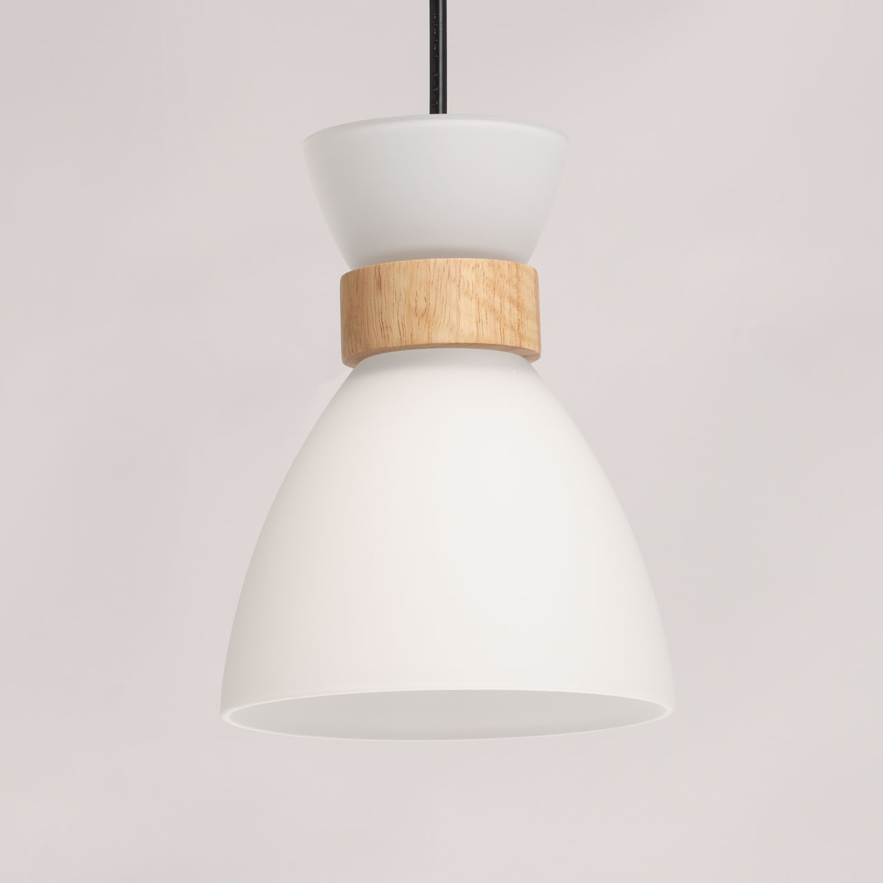 Основание подвеса выполнено из натурального дерева светлого цвета. Отдельные элементы основания выполнены из металла и окрашены в черный цвет. Стеклянный плафон с внутренней стороны окрашен в белый цвет. Подвес декорирован элементами из светлого натурального дерева.