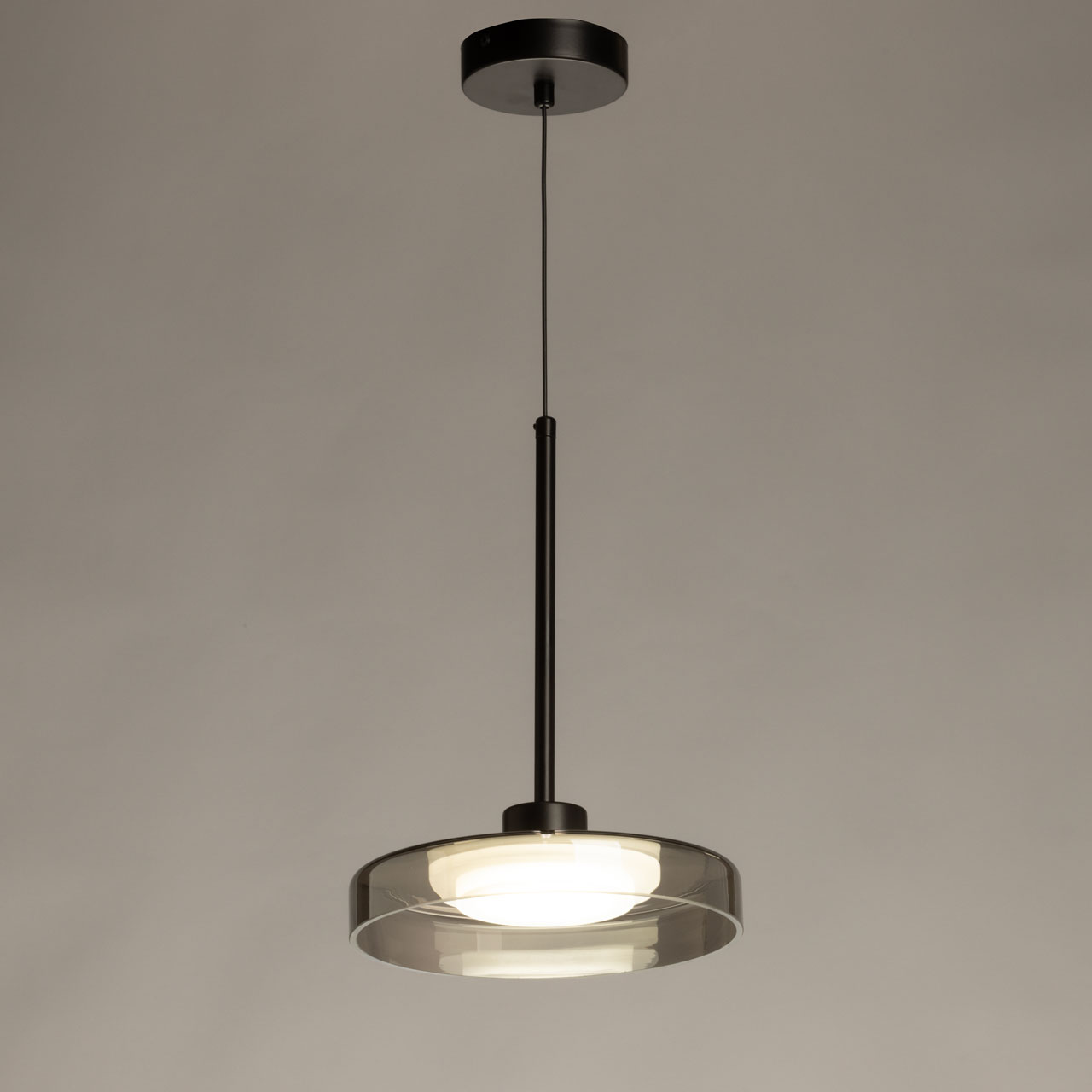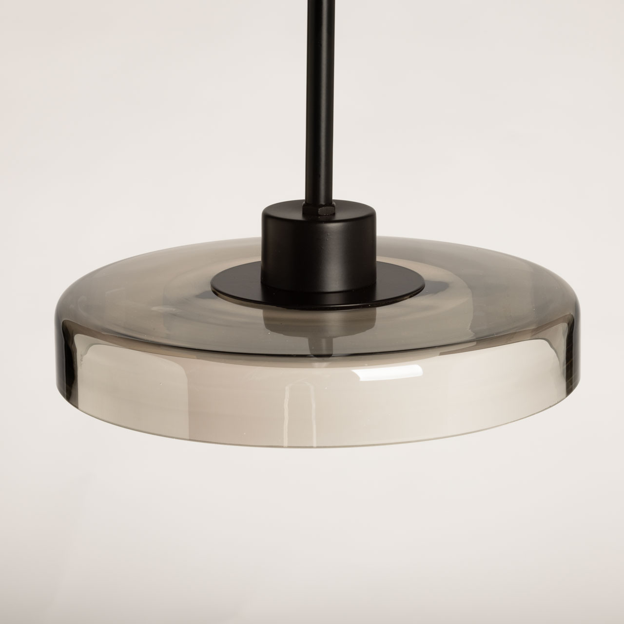 Металлическое основание светильника окрашено в черный цвет. Стеклянный плафон гальванизирован в дымчатый цвет. Светодиодный источник света закрыт белым матовым акрилом.