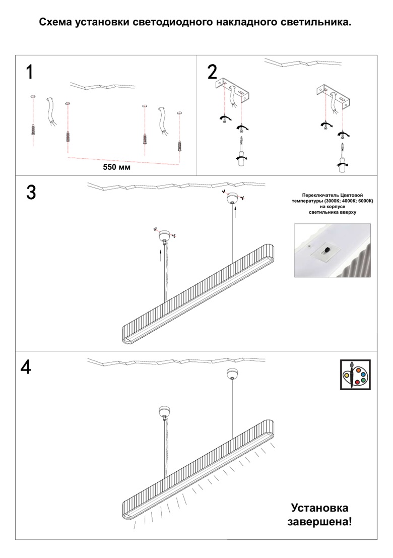 - Цветовая температура, K: 3000-4000-6000