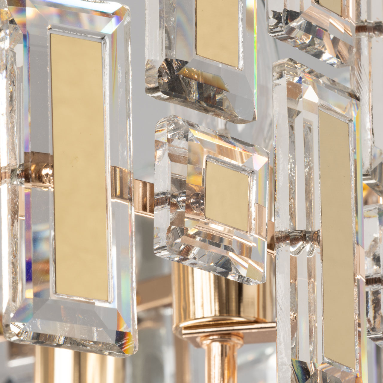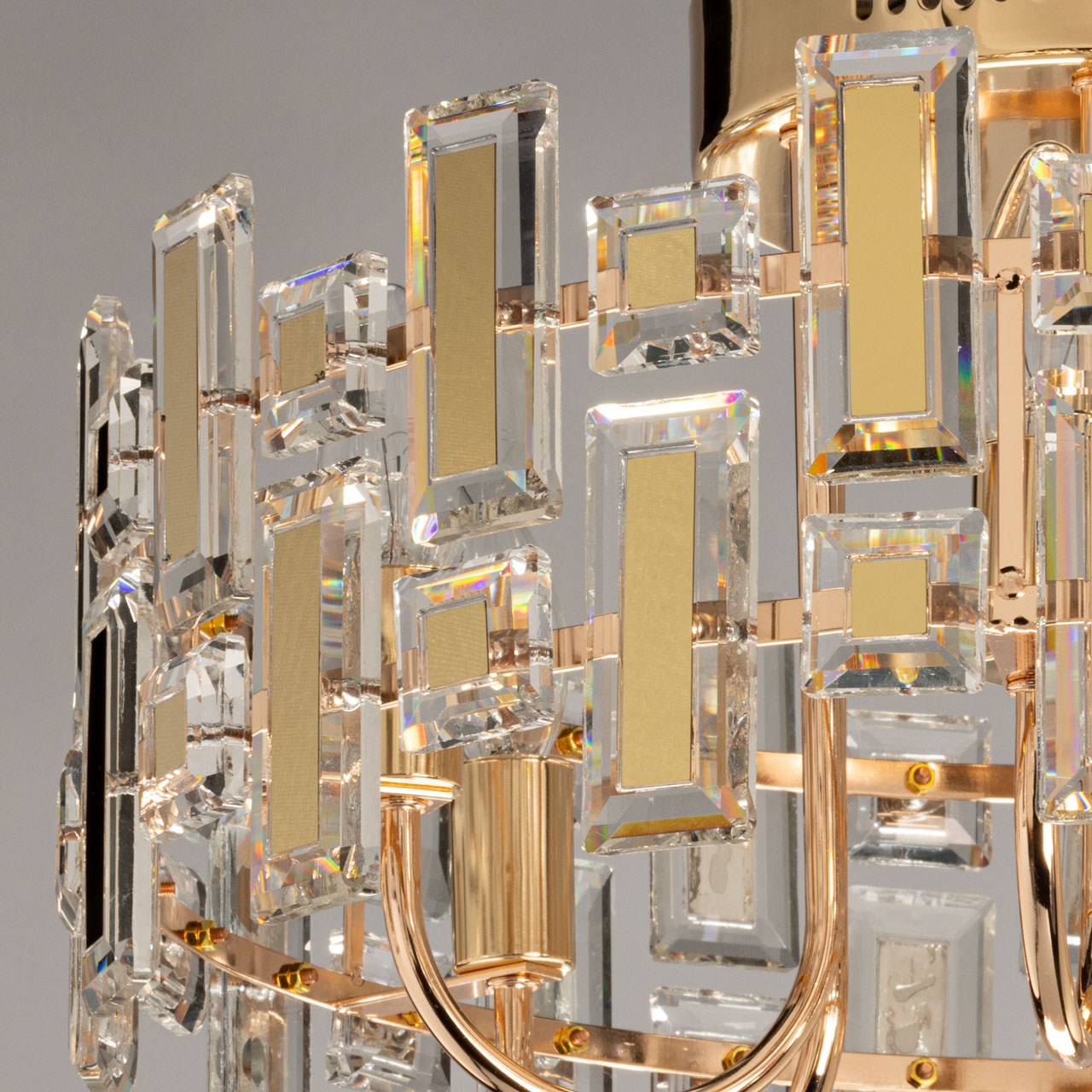 Металлическое основание потолочной люстры гальванизировано в цвет золота. Люстра декорирована прозрачным хрусталем прямоугольной формы. Хрустальные элементы разного размера дополнительно декорированы металлическими пластинами, гальванизированными в цвет основания.
