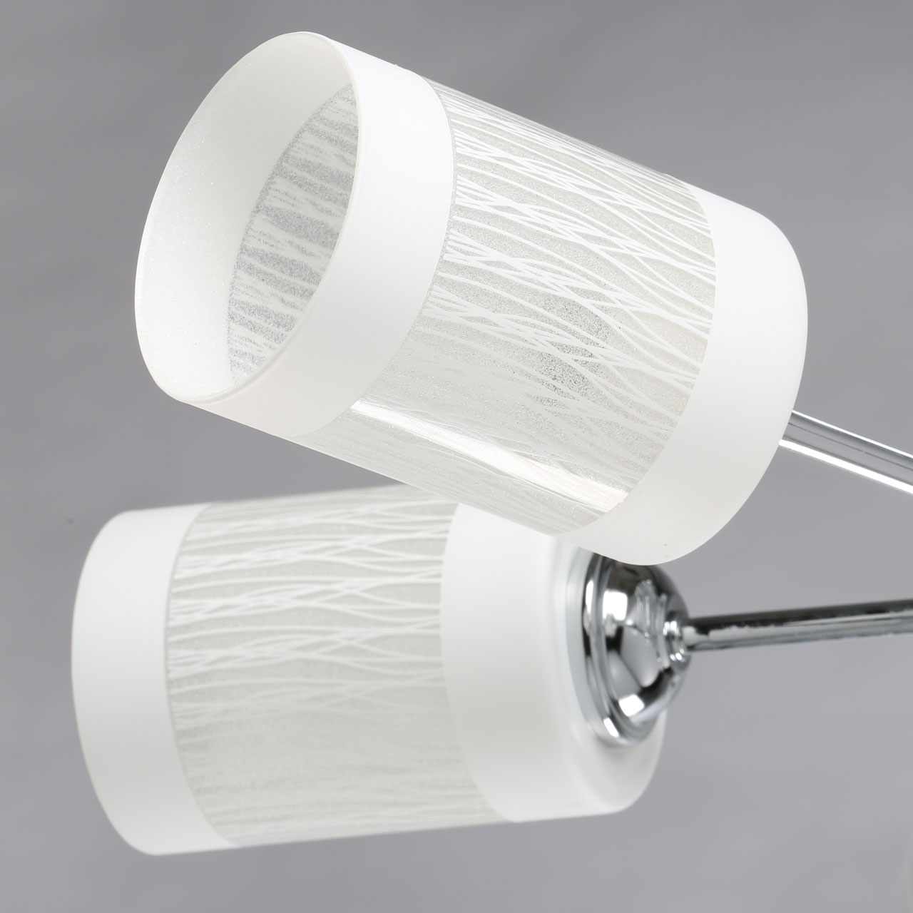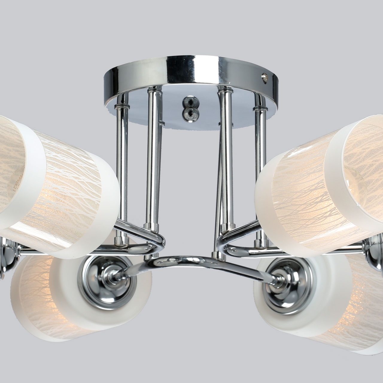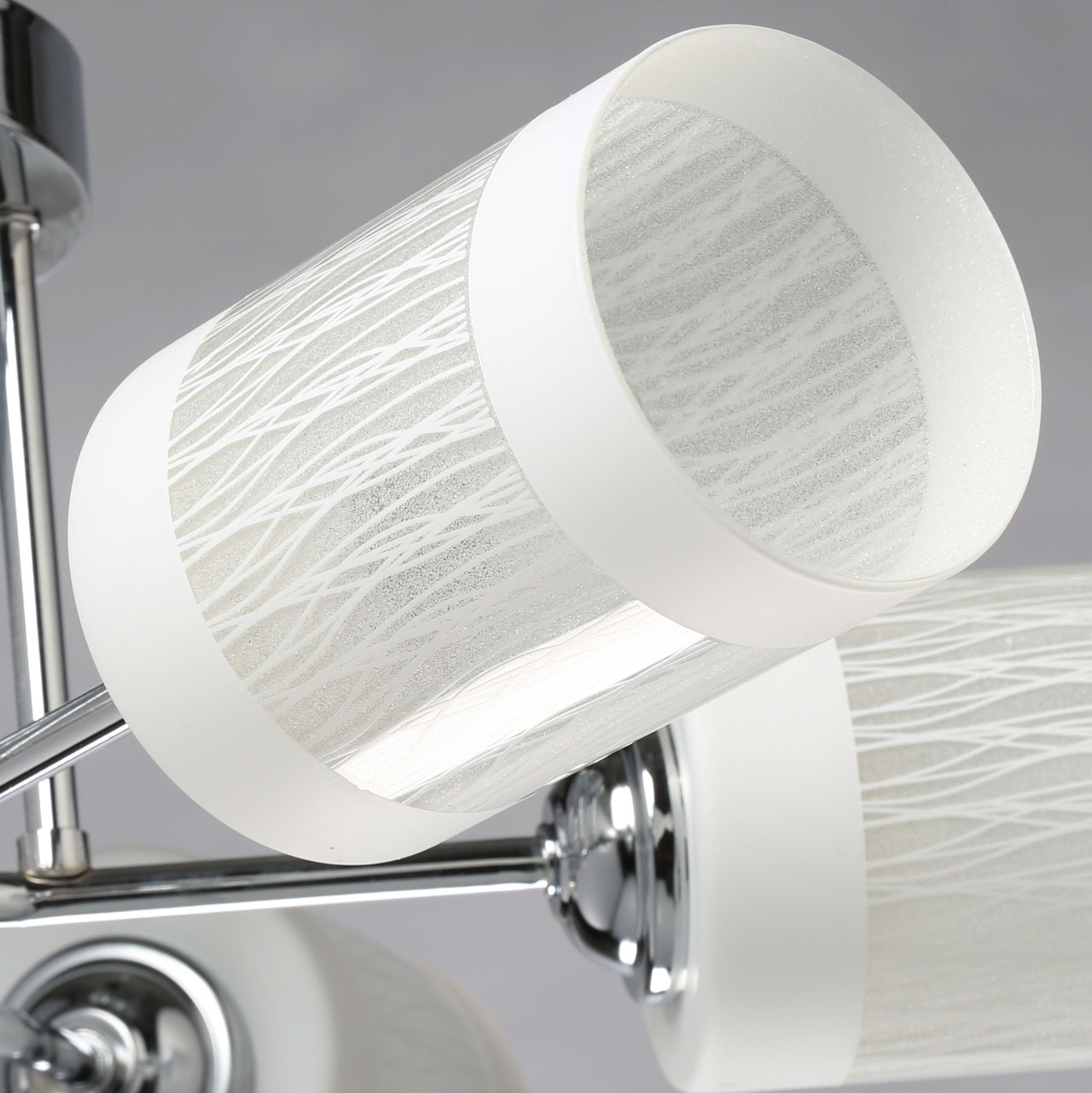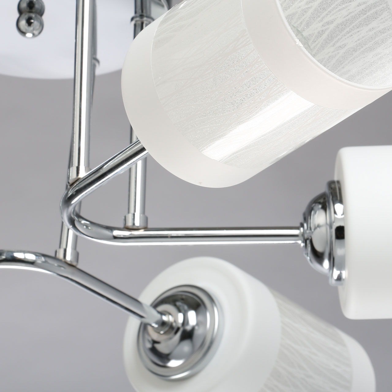 Основание потолочного светильника изготовлено из металла и покрыто хромом. Серебро отлично сочетается с плафонами из белого матового стекла. Оригинальная деталь – рожки, изнутри декорированные стеклянной крошкой, которая отражает свет и рассеивает его, создавая эффект перламутра.