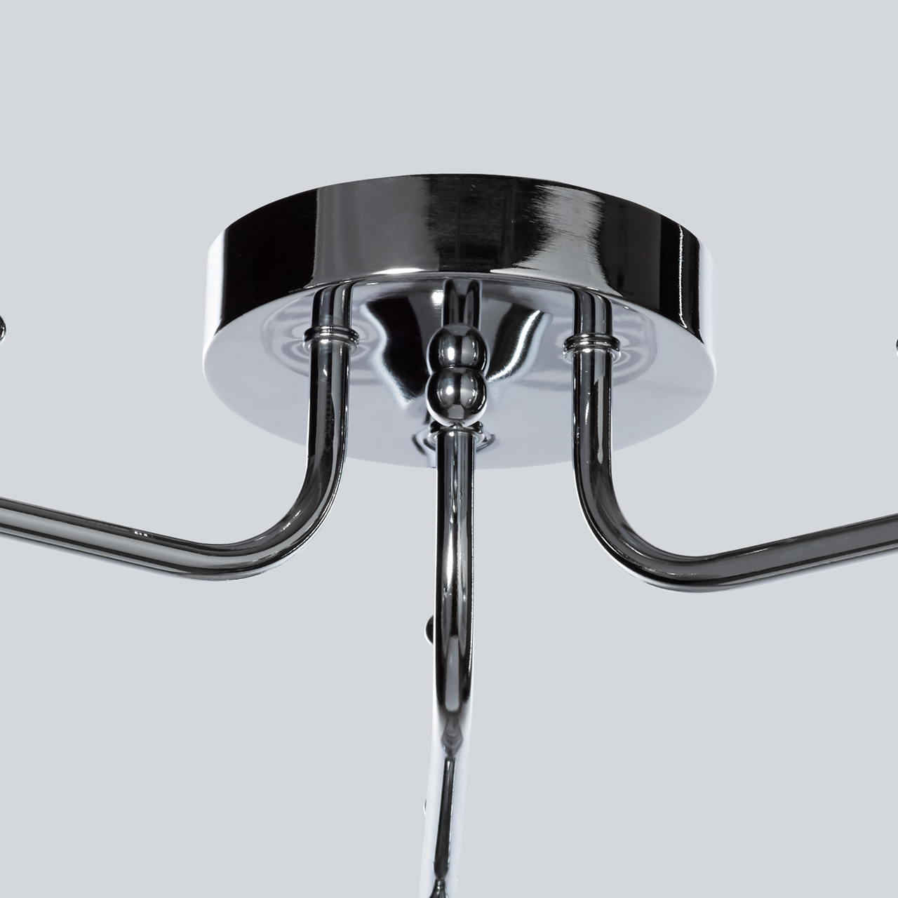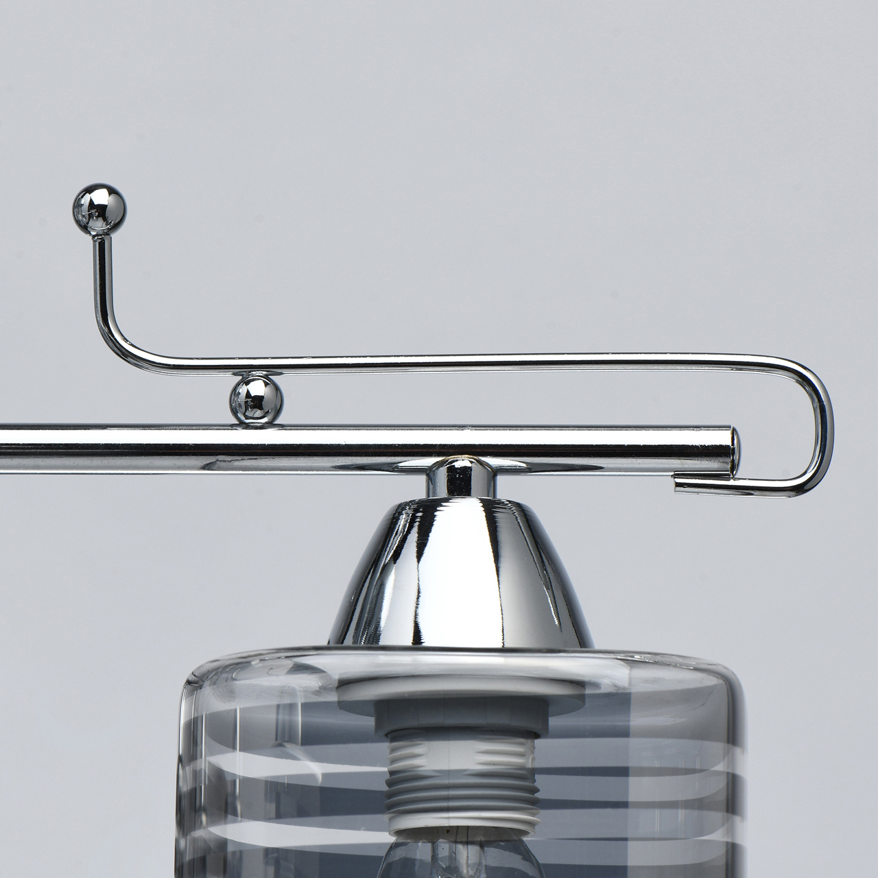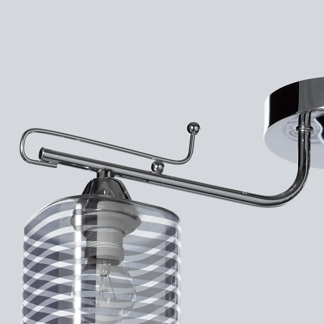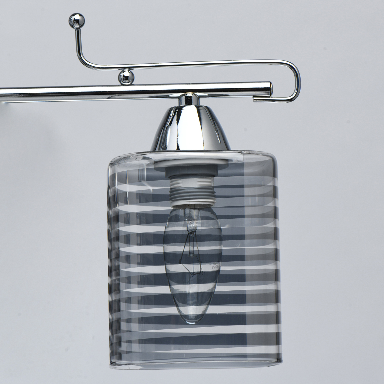 Основание светильника выполнено из металла и гальванизировано в цвет хрома. Стеклянные прозрачные плафоны гальванизированы в дымчатый цвет по трафарету в полоску.