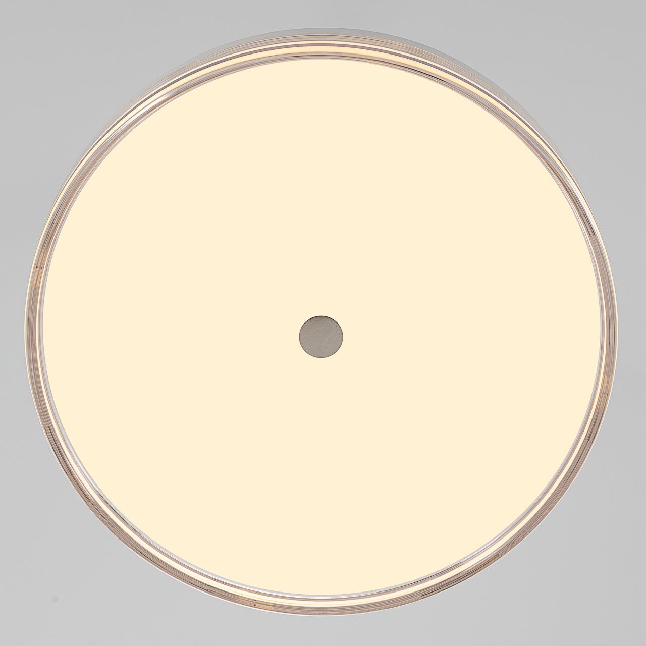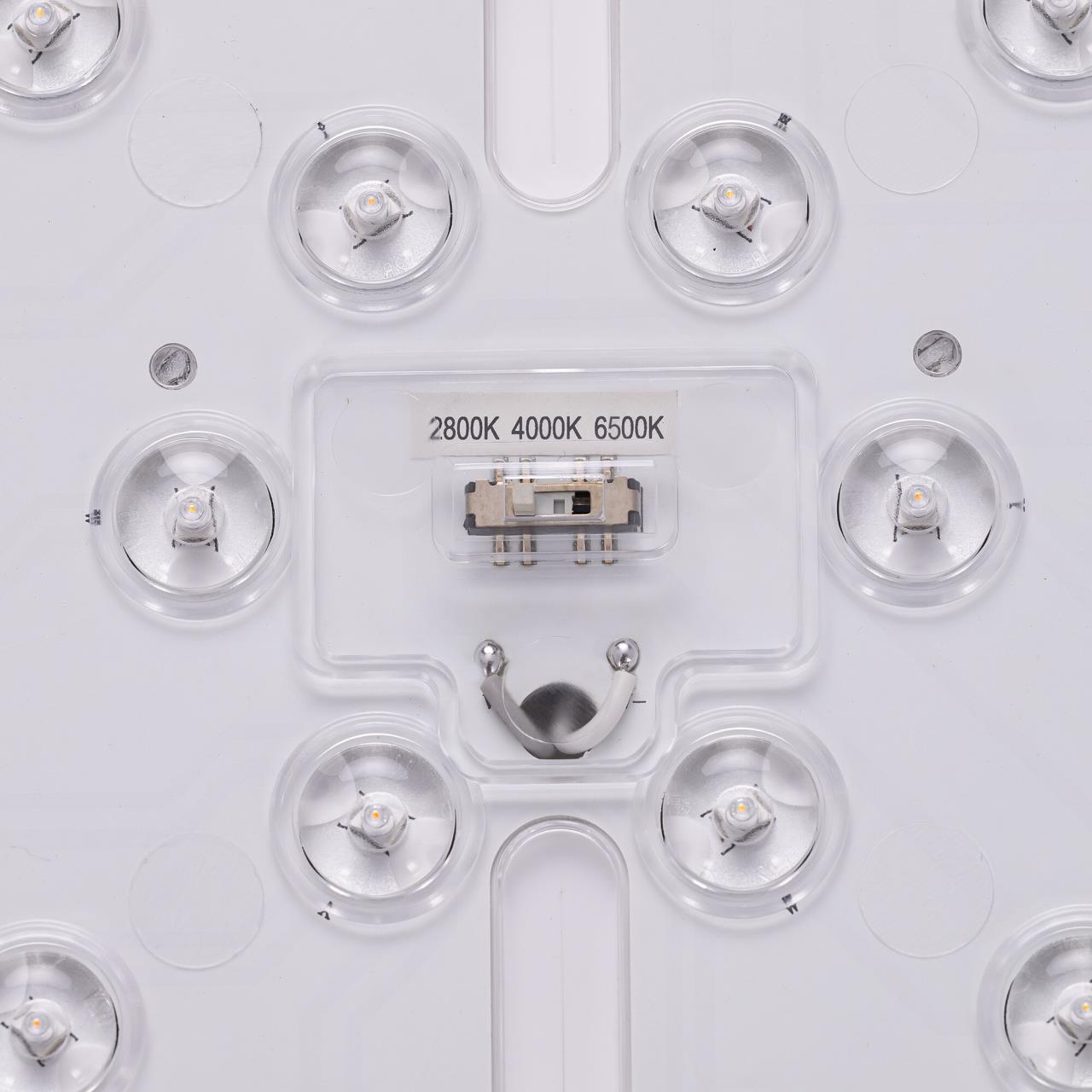 Корпус светильника изготовлен из высокопрочного полимера, рассеиватель — из оптического полимера, причем внешняя часть — прозрачная с глянцевой поверхностью, а внутри добавлена матовая вставка. Общий диаметр светильника — 40см. Источником света служат встроенные светодиоды, при установке вы можете выбрать температуру свечения (теплый, нейтральный или белый свет). Но в любом случае, свет не будет резать глаза и утомлять зрение, заливая пространство мягким потоком без мерцания и пульсаций.