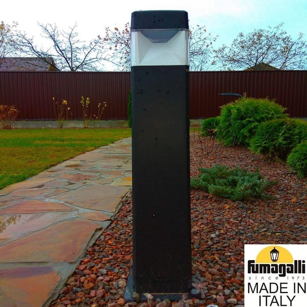 Садовый светильник-столбик FUMAGALLI серии ELISA, модель ELISA 800 - изготовлены в Италии. Используются для освещения парковых дорожек, тротуарных настилов, газонов, веранд, беседок, подпорных стенок, декоративного и дизайнерского освещения. Подойдут и для других внутренних и уличных интерьеров, где требуется ровное, дизайнерское освещение. Отражатель светильника белого цвета, раскидывает световой поток широкими лучами на четыре стороны. Это позволяет получить и высокую степень освещенности от светодиодной лампы . Высокая степень защиты от пыли и влаги IP 55 позволяет использовать садовые столбики ELISA 800 на улице без ограничений. Светильник устанавливается на землю (фундамент) или другую горизонтальную поверхность Корпус не проводит электричество! Для подсветки строений рекомендуем обратить внимание на консольный светильник ELISA WALL, который крепится на стену или другую вертикальную поверхность (забор, колонну). Если вам понадобится светильник из этой же коллекции для ландшафтной подсветки деревьев, кустарников, альпийских горок - можно использовать ELISA SPIKE на колышке. Для освещения парковых дорожек, колон заборов, ландшафтного дизайна возможно комбинировать ландшафтные светильники серии ELISA в любой последовательности. Корпус изготовлен из современного вандалостойкого не горючего полимера RESIN. Прочного, окрашенного в массе, не ржавеющего и не выгорающего на солнце, не проводящего электричество. Рассеиватель выполнен из антивандального, не мутнеющего и не горючего PMMA. Срок службы светильника - не менее 20 лет. Не требуется трансформатор. Напряжение питания - 220 В. Температура эксплуатации от -60 до +90. При заказе требуется выбрать цвет корпуса.