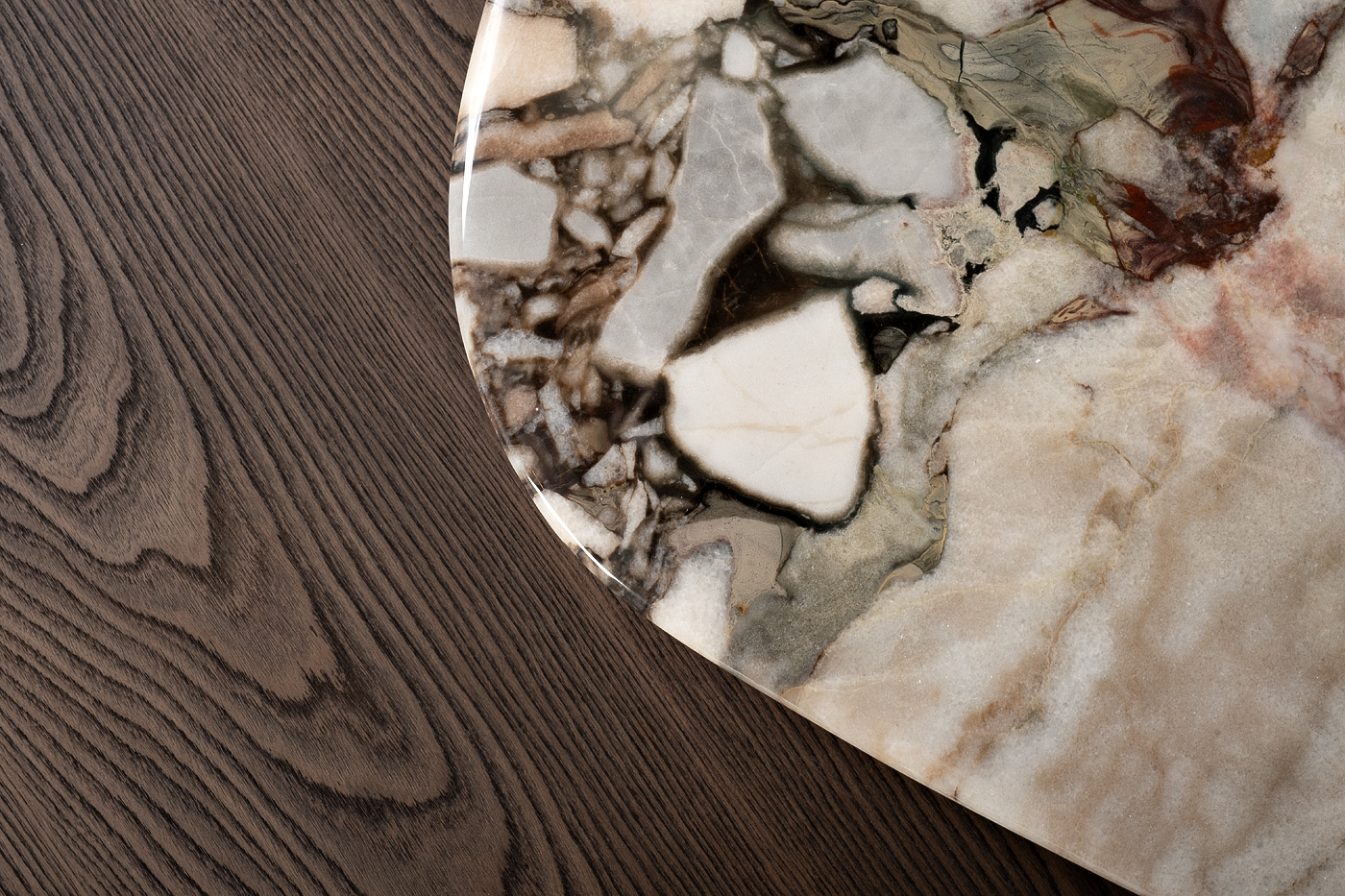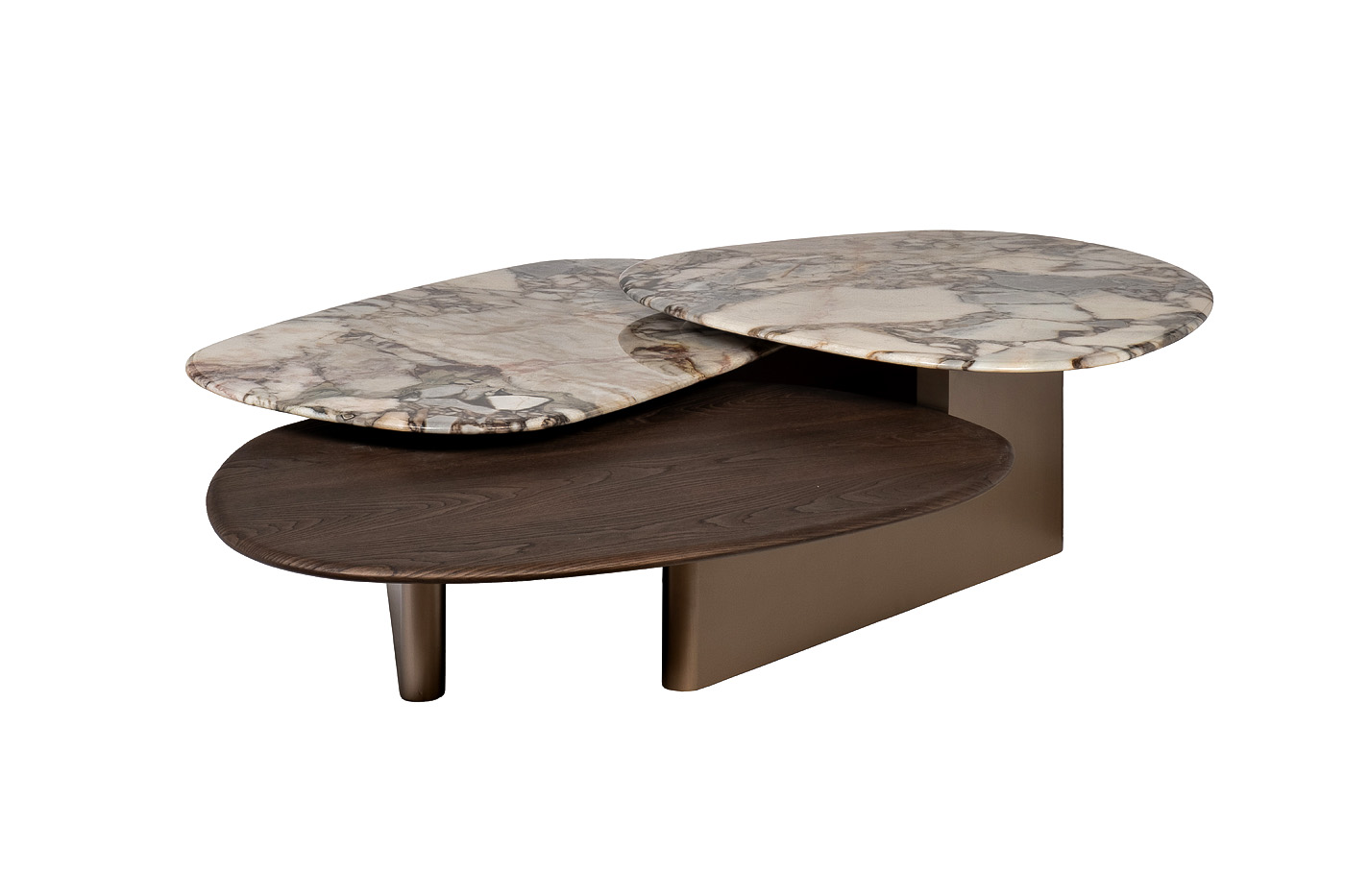 Необычный журнальный стол с тремя столешницами станет изысканным украшением современной гостиной или холла. Две столешницы выполнены из натурального мрамора светлого оттенка с красивым природным рисунком. Третья столешница, расположенная на нижнем уровне, изготовлена из МДФ, отделанного темным шпоном. Такое сочетание материалов и фактур выглядит очень эффектно и подчеркивает уникальность авторского дизайна.Столешница вырезана из натурального мрамора! Рисунок и цвет каждой столешницы индивидуален, неповторим и уникален!
