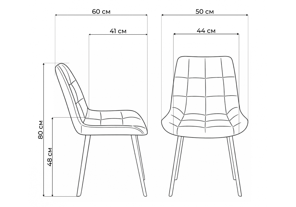 Материал каркаса - металл; Материал сиденья - велюр; Материал обивки - велюр; Цвет ножек - белый; Ширина - 50; Глубина - 60; Высота - 80; Ширина сиденья - 44; Глубина сиденья - 41; Высота сиденья - 48;