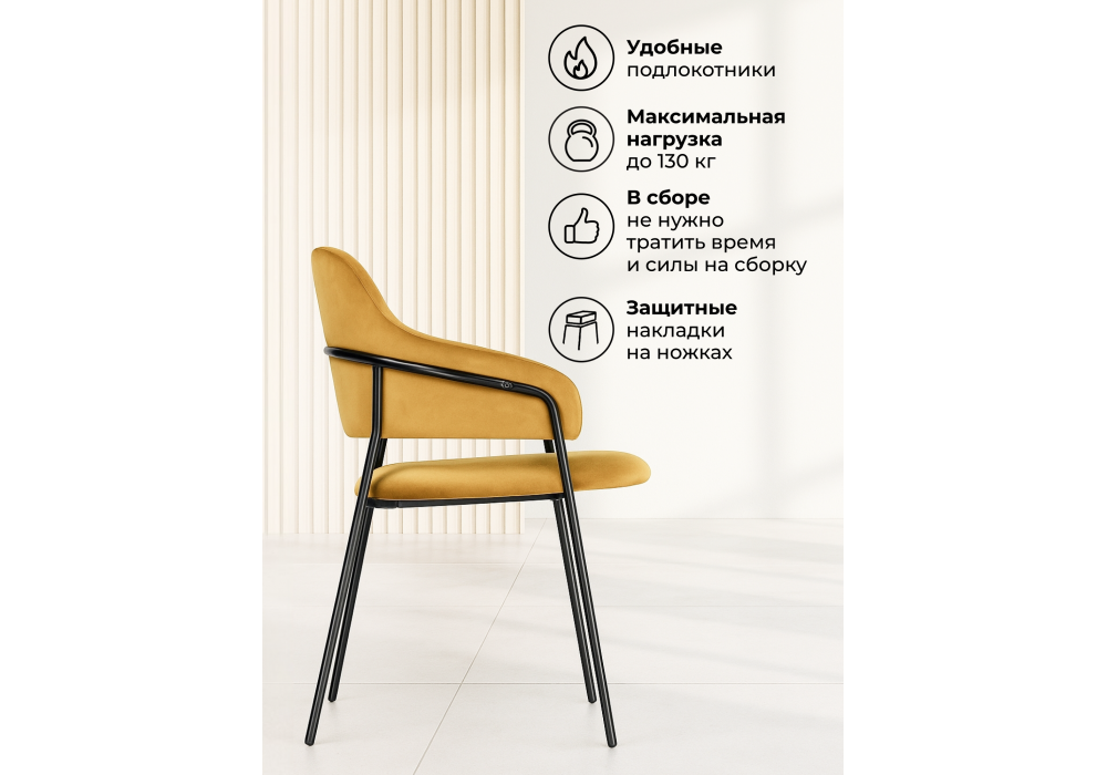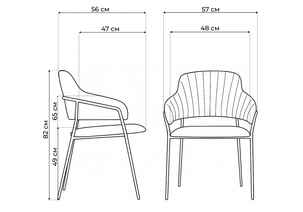 Высота подлокотников: 65 см. Материал каркаса - металл; Материал сиденья - велюр; Материал обивки - велюр; Ширина - 57; Глубина - 56; Высота - 82; Ширина сиденья - 48; Глубина сиденья - 47; Высота сиденья - 49;