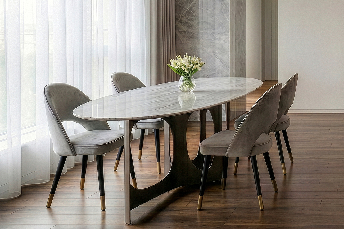 В больших домах или квартирах часто появляется потребность обустроить обеденную зону, а значит выбрать и купить стул для столовой. Если в помещении преобладают теплые светлые тона, то в качестве интересного варианта можно выбрать прочный и устойчивый серо-бежевый стул, который идеально дополнит интерьер вашей столовой. Также подойдет такой обеденный стул для кухни, выполненной в современных интерпретациях классики или модерне. Наконечники выполнены в металле цвета матовое золото.
