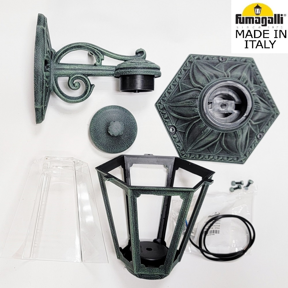 Светильники уличные настенные FUMAGALLI серии ANNA, модель ANNA/BISSO DN. Консольный уличный светильник для монтажа на стену. Настенный кронштейн BISSO малого размера и светильник ANNA установленный "вниз". Используются для фасадного и архитектурного освещения в стиле "классика". Место установки уличных светильников - фасады, колонны и другие вертикальные поверхности исторических зданий, котеджей, загородных домов, церквей, а так же, другие места где требуется и возможна установка фонарей. Изготовлены в Италии, по уникальным технологиям "FUMAGALLI" из современного композитного полимера RESIN. Этот материал в 5 раз прочнее металла, не ржавеет, не окисляется, не выгорает на солнце, его не нужно красить. Все светильники пыле-влаго защищены по стандарту IP55 (защита от пыли, защита от струй воды, падающих под любым углом). Рассеиватель выполнен из антивандального, не мутнеющего и не горючего PMMA (ПолиМетилМетаАкрилат). Срок службы светильника - не менее 20 лет. Температура использования от -60 до +90. В серии ANNA есть фонари в настенном (BISSO/ANNA, PORPORA/ANNA) подвесном (SICHEM/ANNA, SICHEM/ANNA 3L) и наземном исполнении (IAFAET.R/ANNA, ALOE.R/ANNA, ARTU/ANNA, GIGI/ANNA, RICU/ANNA, RICU/ISSO/ANNA 1L, RICU/ISSO/ANNA 2L, RICU/ISSO/ANNA 3L) со столбами разной высоты, с разным количеством и конфигурацией голов. Консоли настенных фонарей и кронштейны светильников на столбах освщения могут устанавливаться вверх/вниз. Столбы выше 150 см имеют в основе мощную стальную трубу с двойной оцинковкой. При заказе требуется выбрать цвет корпуса, цвет плафона и тип патрона. Возможен светодиодный вариант с LED цоколем GX-53. По стилю и дизайну серия уличных светильников ANNA похожа на светильники среднего размера серии RUT и на светильники большого размера серии NOEMI. По размеру ANNA относится к малым светильникам как серия SABA и GLOBE 250.