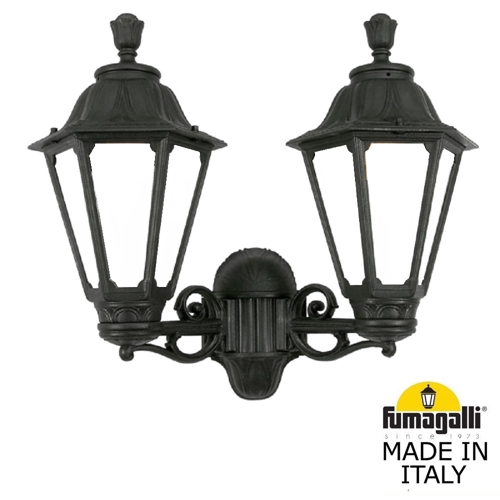 Светильники уличные настенные FUMAGALLI серии RUT, модель PORPORA/RUT. Консольный уличный светильник из 2-х фонарей RUT, на кронштейнах BISSO малого размера, для монтажа на стену. Используются для фасадного и архитектурного освещения в стиле "классика". Место установки уличных светильников - фасады, колонны и другие вертикальные поверхности исторических зданий, котеджей, загородных домов, церквей, а так же, другие места где требуется и возможна установка фонарей. Изготовлены в Италии, по уникальным технологиям "FUMAGALLI" из современного композитного полимера RESIN. Этот материал в 5 раз прочнее металла, не ржавеет, не окисляется, не выгорает на солнце, его не нужно красить. Все светильники пыле-влаго защищены по стандарту IP55 (Пылезащищенные, защита от водяных струй с любого направления). Рассеиватель выполнен из антивандального, не мутнеющего и не горючего PMMA (ПолиМетилМетаАкрилат). Срок службы светильника - не менее 20 лет. Температура использования от -60 до +90. В серии RUT есть фонари в настенном (BISSO/ RUT, OFIR/ RUT, MIRRA/ RUT, PORPORA/ RUT) подвесном (SICHEM/ RUT) и наземном исполнении (MINILOT/ RUT, MIZAR.R/ RUT, IAFAET.R/ RUT, ALOE.R/ RUT, ARTU/ RUT, GIGI/ RUT, RICU/ RUT, RICU/ISSO/ RUT 2L, NEBO/ RUT, NEBO OFIR/ RUT 2L, NEBO OFIR/ RUT 3L) со столбами разной высоты, с разным количеством и конфигурацией голов. Консоли настенных фонарей и кронштейны светильников на столбах освщения могут устанавливаться вверх/вниз. Столбы выше 150 см имеют в основе мощную стальную трубу с двойной оцинковкой. При заказе требуется выбрать цвет корпуса, цвет плафона и тип патрона. По стилю и дизайну серия уличных светильников RUT похожа на светильники малого размера серии ANNA и на светильники большого размера серии NOEMI. По размеру RUT относится к средним светильникам как серия CEFA, SALEM и GLOBE 300.