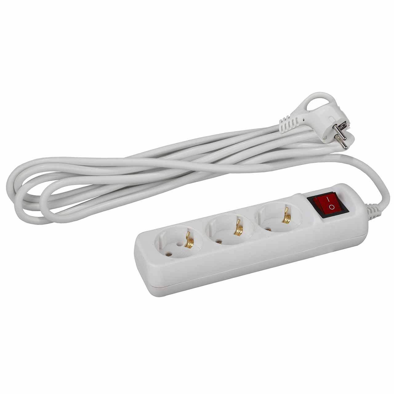 Удлинитель белого цвета на три розетки с заземлением и кнопкой выключения.
